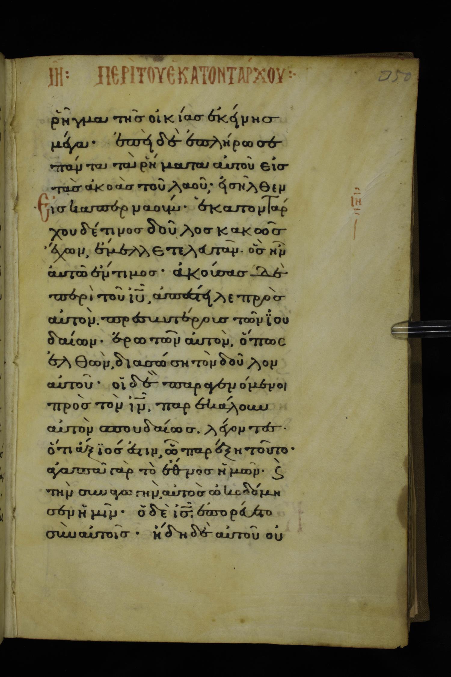 Fourteenth century minuscule of the Gospels on parchment; 332 leaves, 1 column, 20-22 lines per column. Images were taken at the National Library of Greece in Athens.