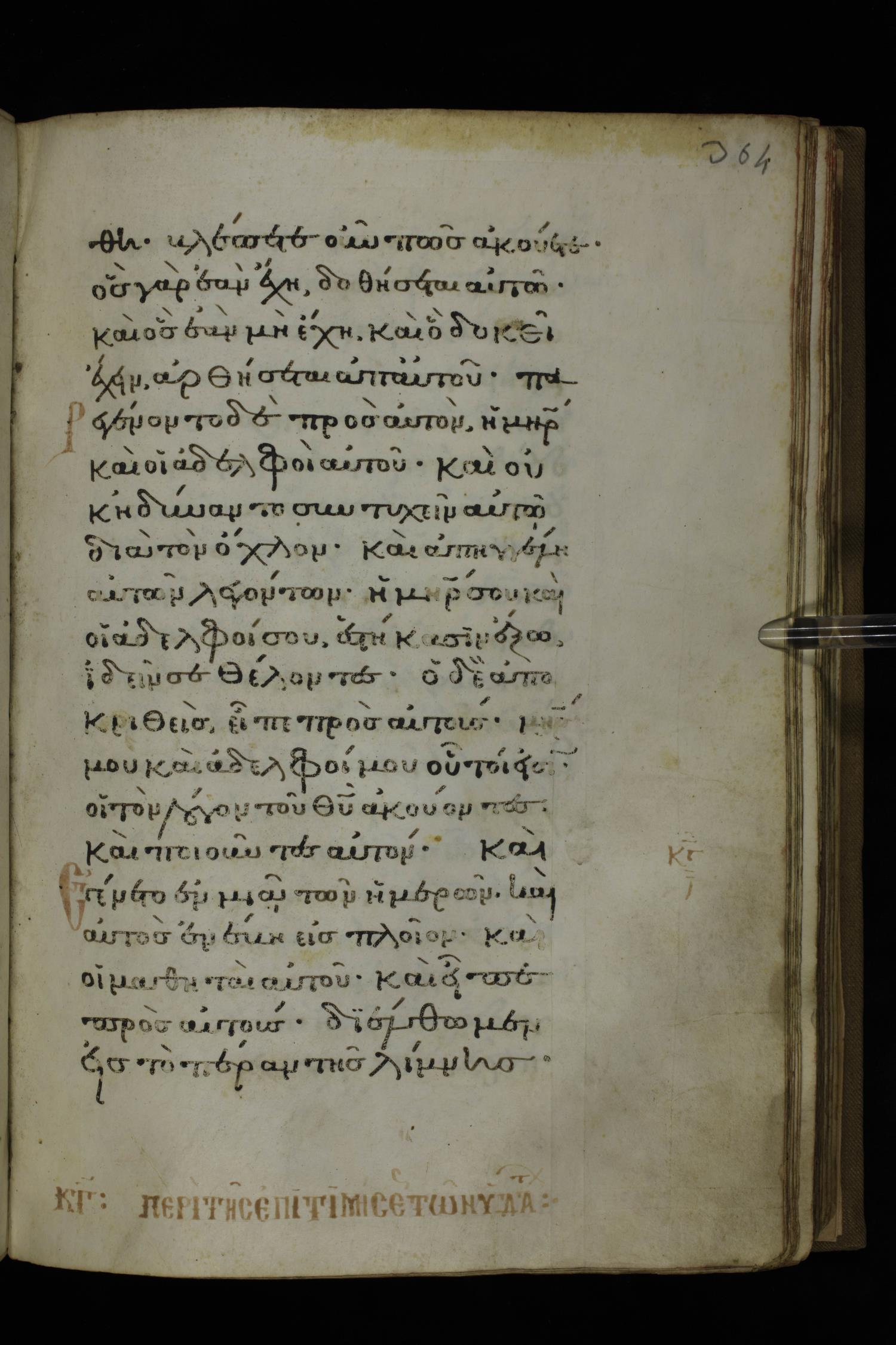 Fourteenth century minuscule of the Gospels on parchment; 332 leaves, 1 column, 20-22 lines per column. Images were taken at the National Library of Greece in Athens.