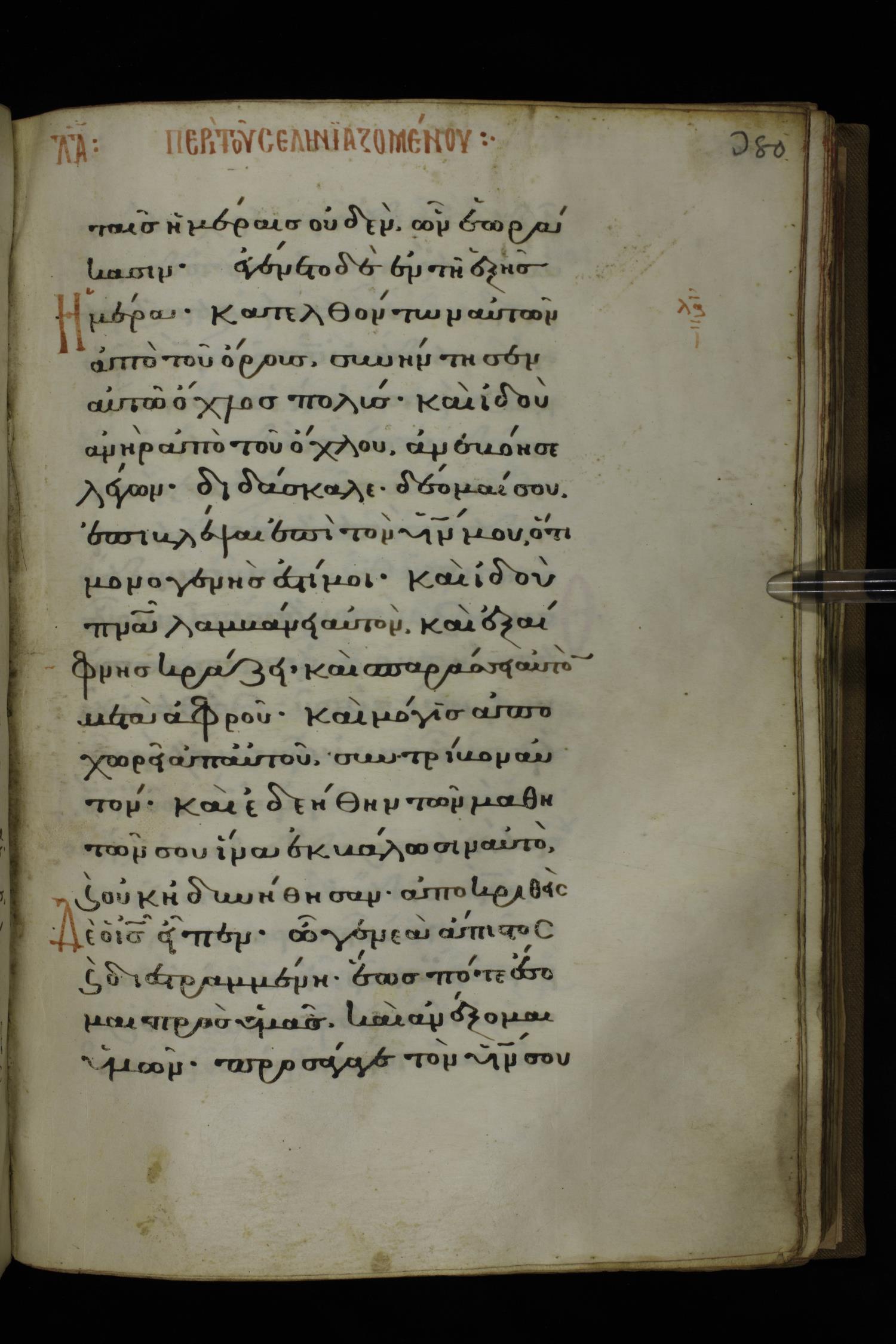 Fourteenth century minuscule of the Gospels on parchment; 332 leaves, 1 column, 20-22 lines per column. Images were taken at the National Library of Greece in Athens.