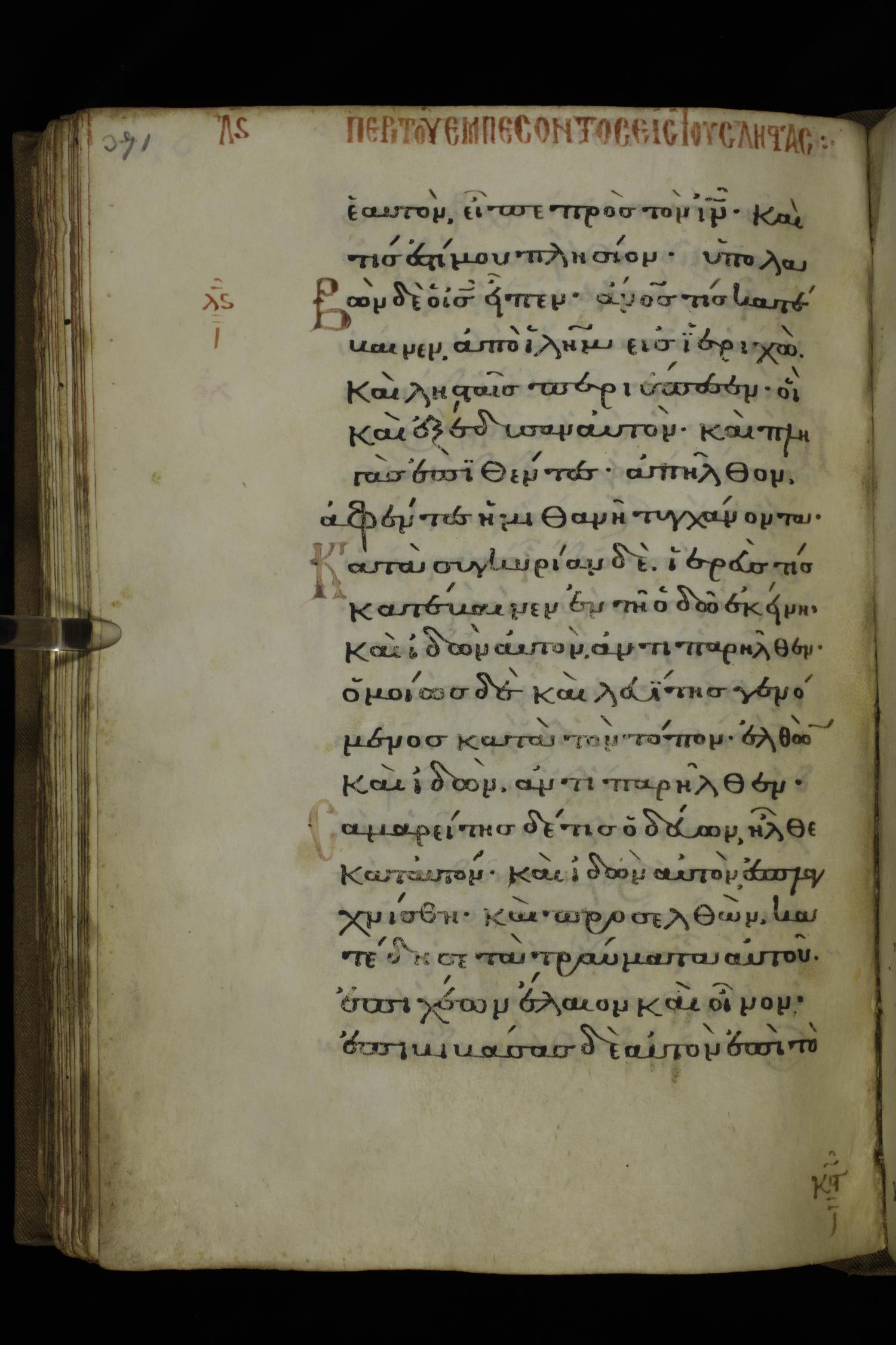 Fourteenth century minuscule of the Gospels on parchment; 332 leaves, 1 column, 20-22 lines per column. Images were taken at the National Library of Greece in Athens.