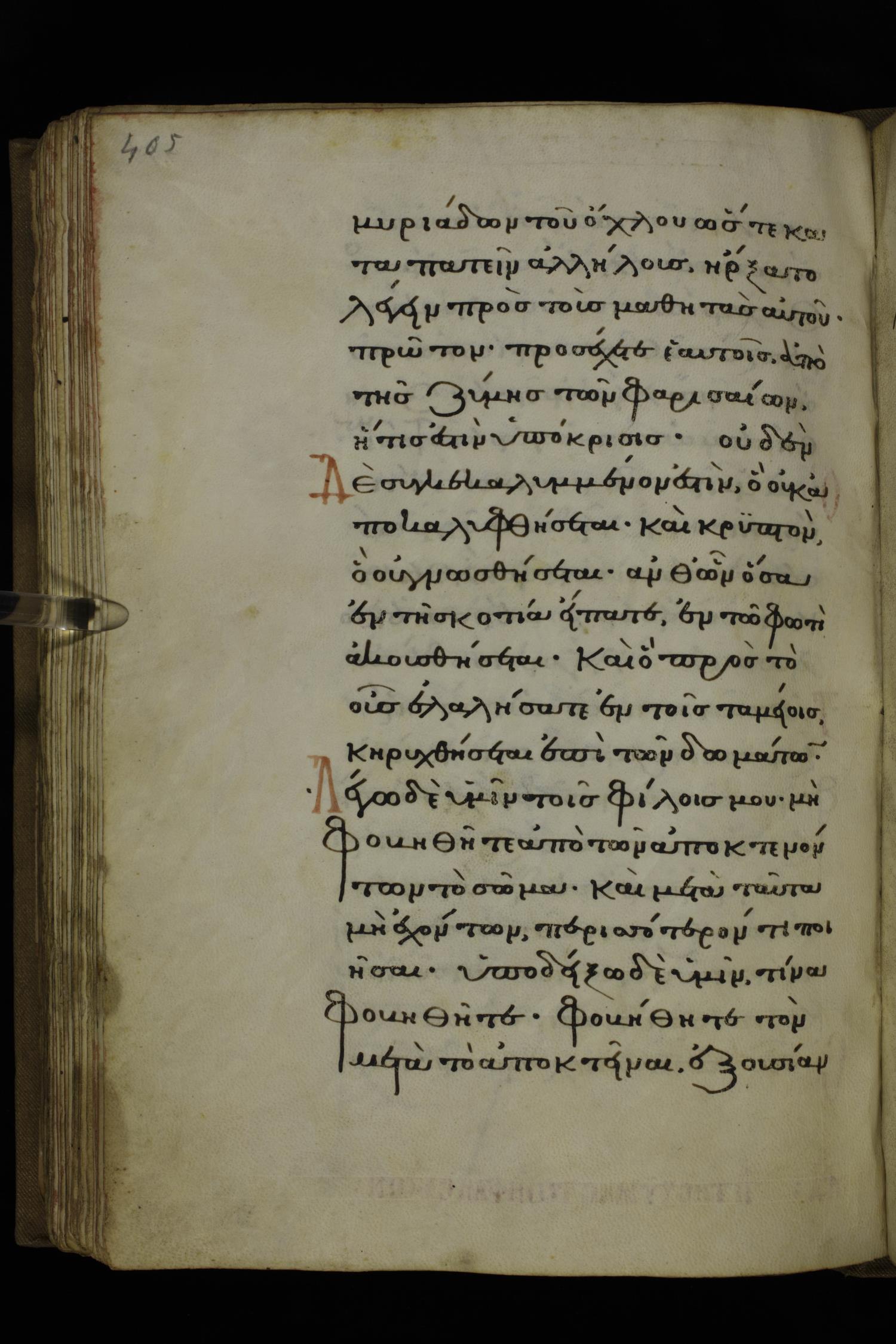 Fourteenth century minuscule of the Gospels on parchment; 332 leaves, 1 column, 20-22 lines per column. Images were taken at the National Library of Greece in Athens.