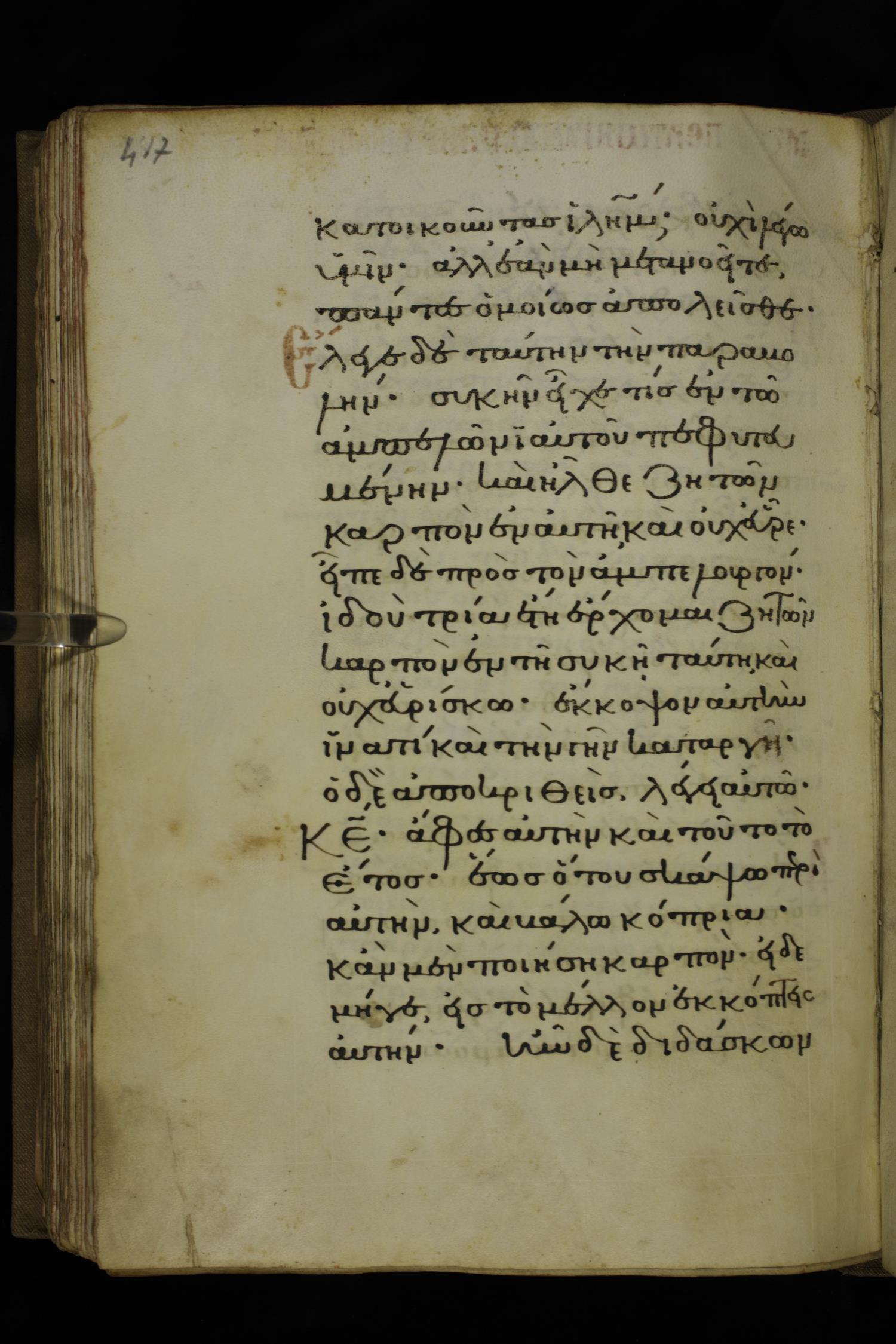 Fourteenth century minuscule of the Gospels on parchment; 332 leaves, 1 column, 20-22 lines per column. Images were taken at the National Library of Greece in Athens.