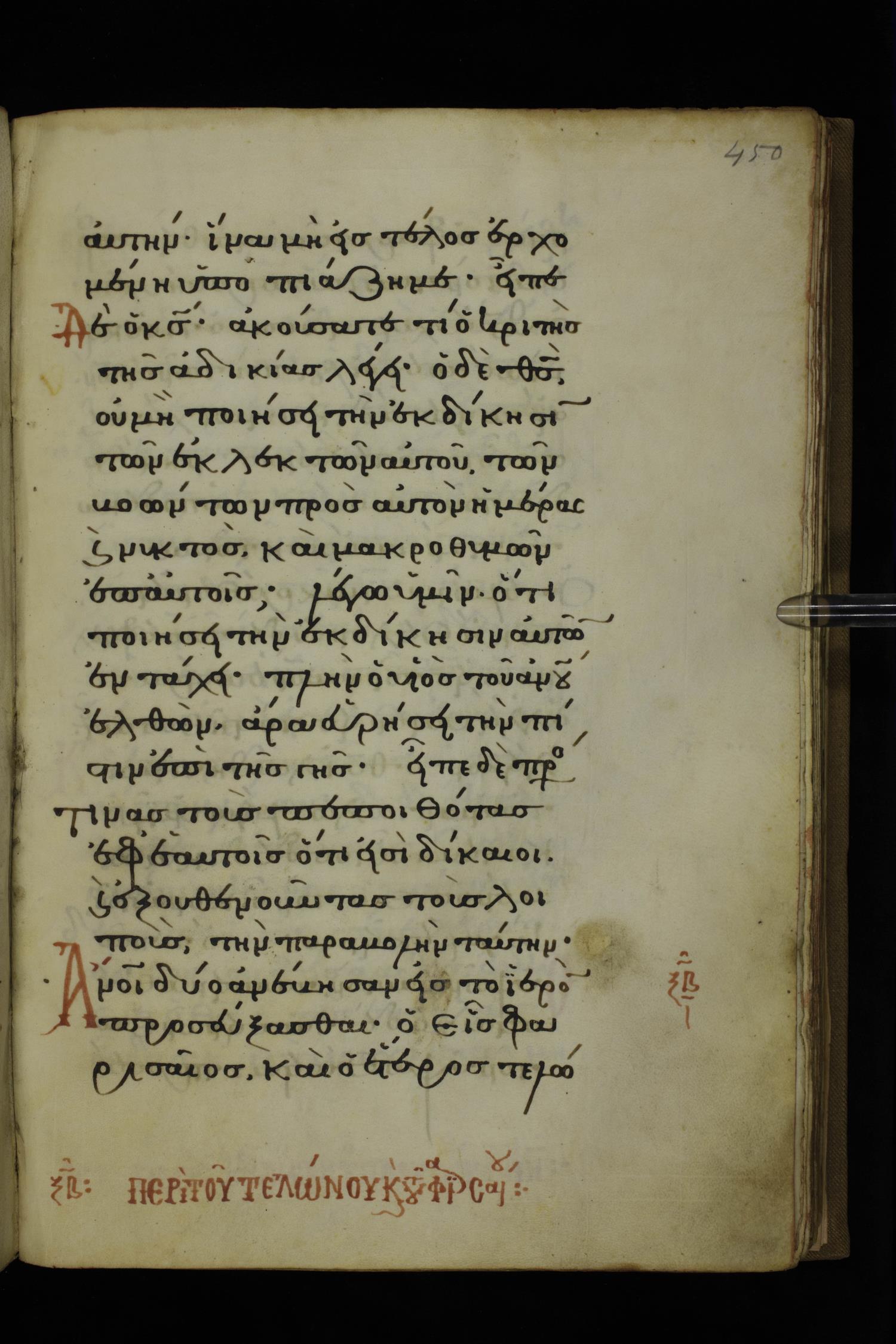 Fourteenth century minuscule of the Gospels on parchment; 332 leaves, 1 column, 20-22 lines per column. Images were taken at the National Library of Greece in Athens.