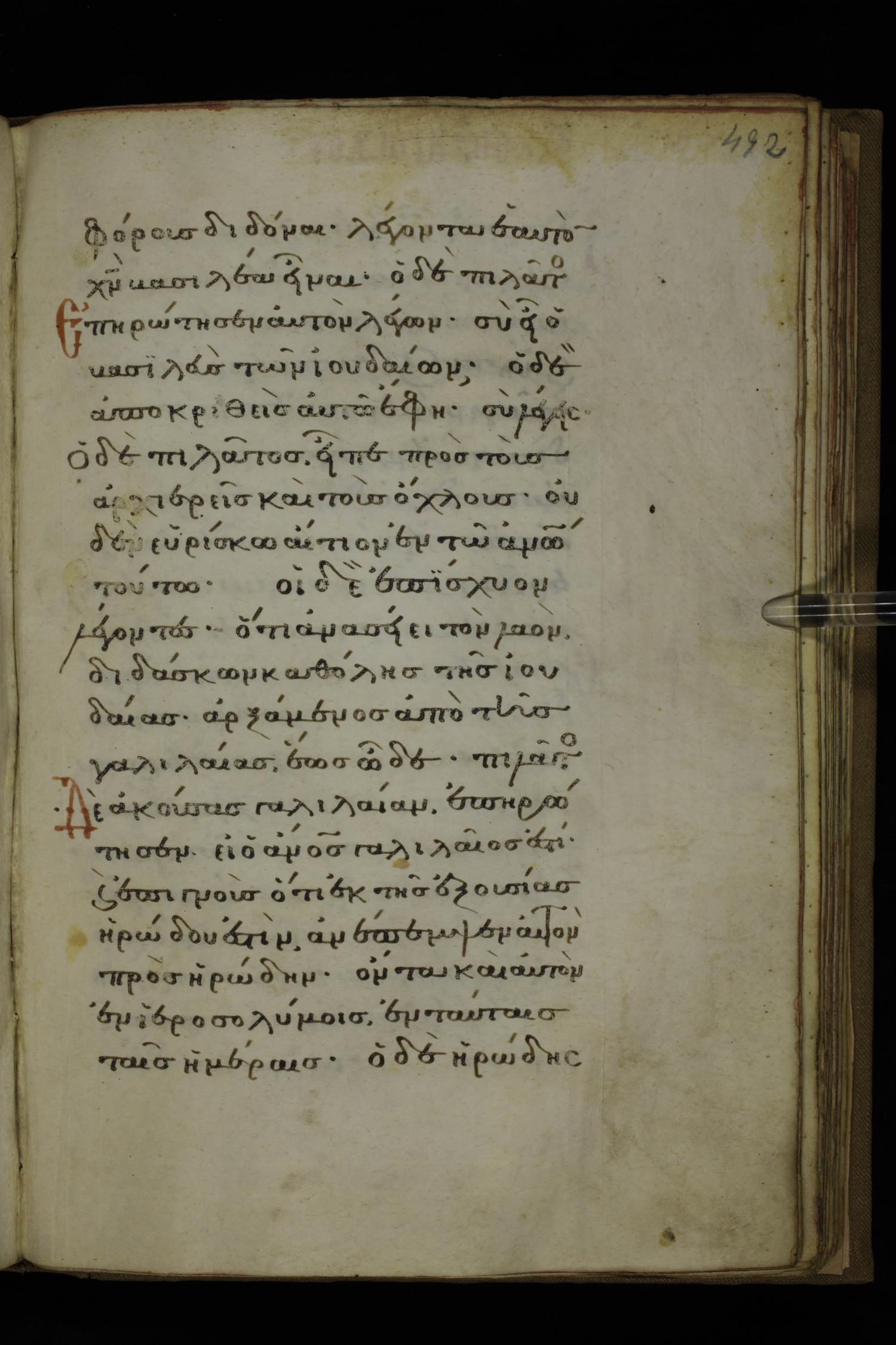 Fourteenth century minuscule of the Gospels on parchment; 332 leaves, 1 column, 20-22 lines per column. Images were taken at the National Library of Greece in Athens.