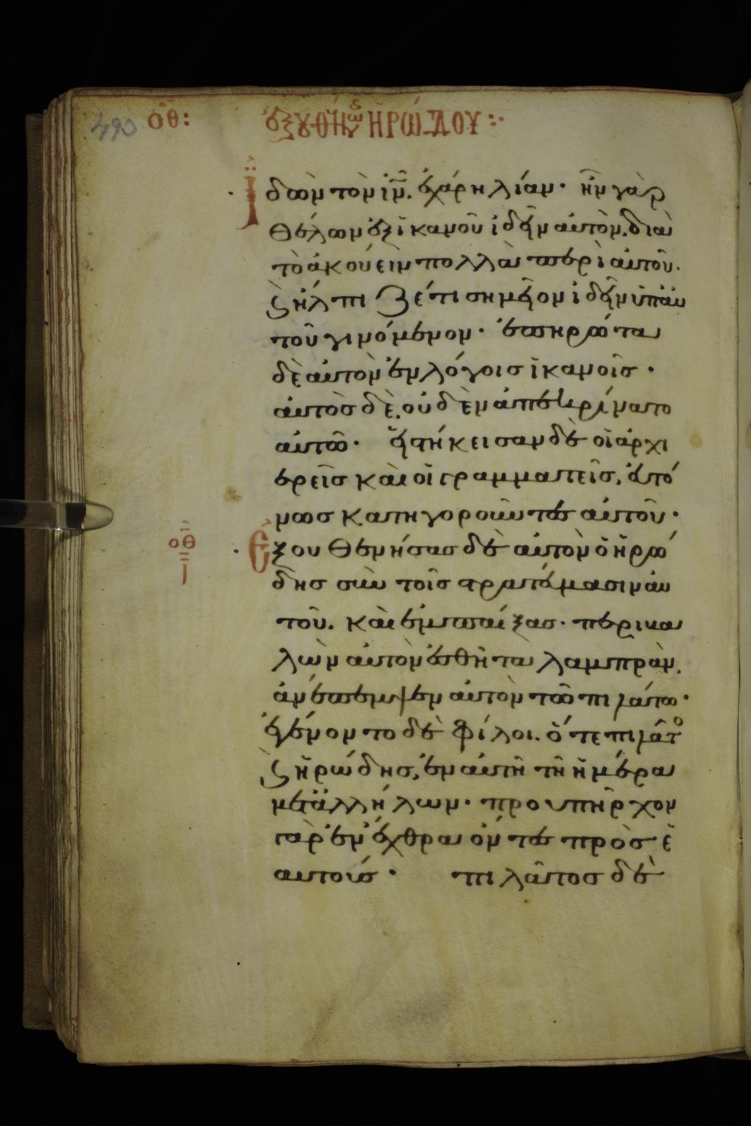 Fourteenth century minuscule of the Gospels on parchment; 332 leaves, 1 column, 20-22 lines per column. Images were taken at the National Library of Greece in Athens.