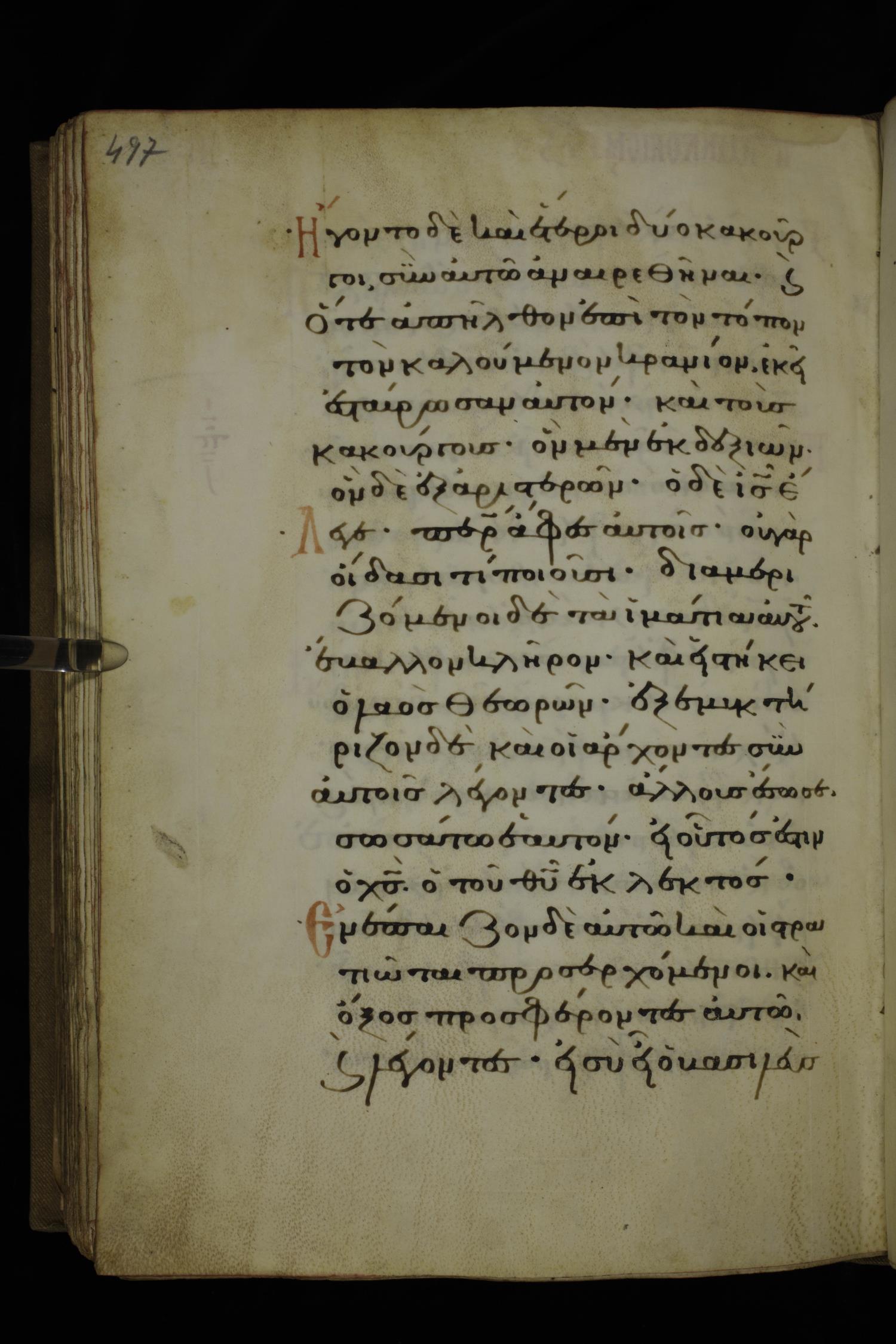 Fourteenth century minuscule of the Gospels on parchment; 332 leaves, 1 column, 20-22 lines per column. Images were taken at the National Library of Greece in Athens.