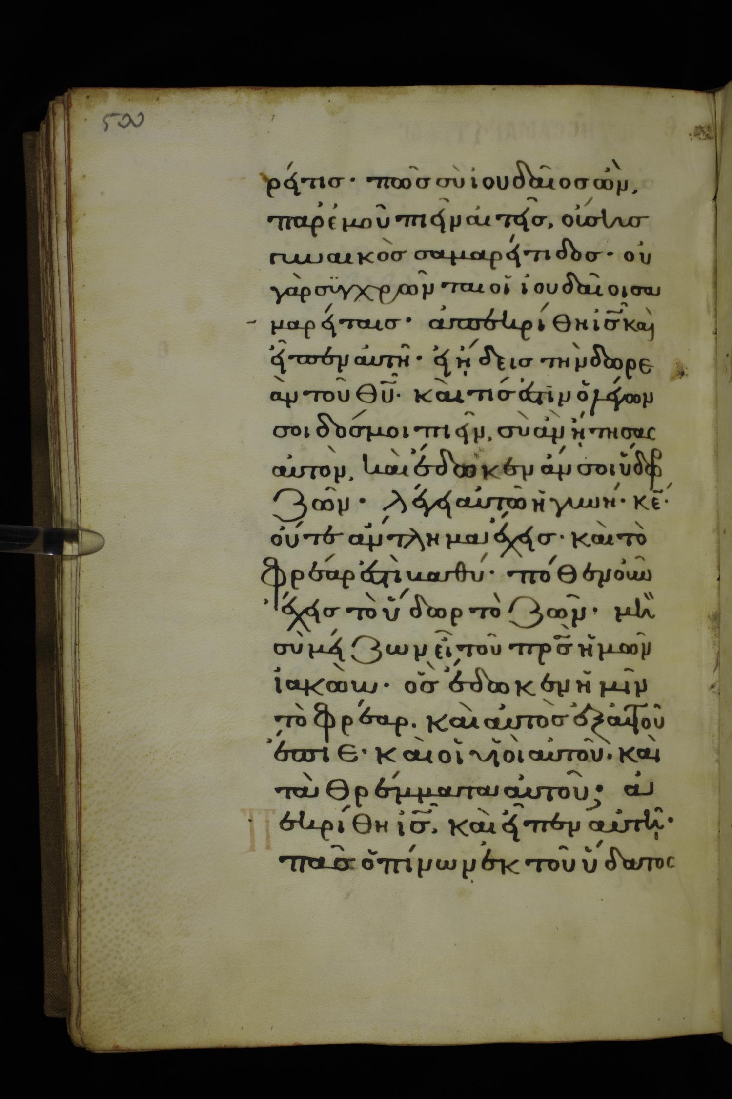 Fourteenth century minuscule of the Gospels on parchment; 332 leaves, 1 column, 20-22 lines per column. Images were taken at the National Library of Greece in Athens.