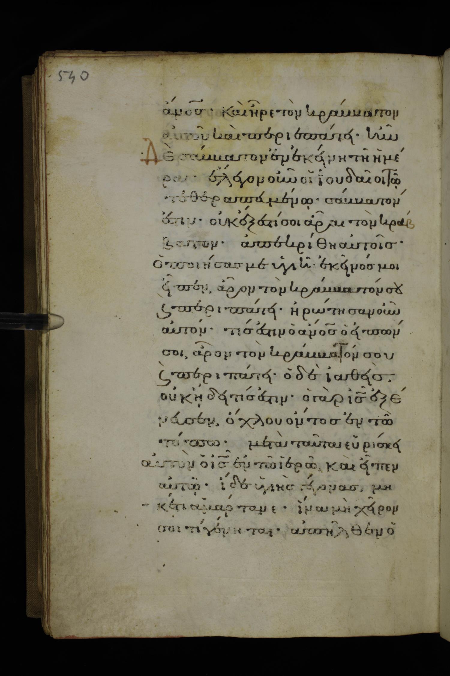 Fourteenth century minuscule of the Gospels on parchment; 332 leaves, 1 column, 20-22 lines per column. Images were taken at the National Library of Greece in Athens.