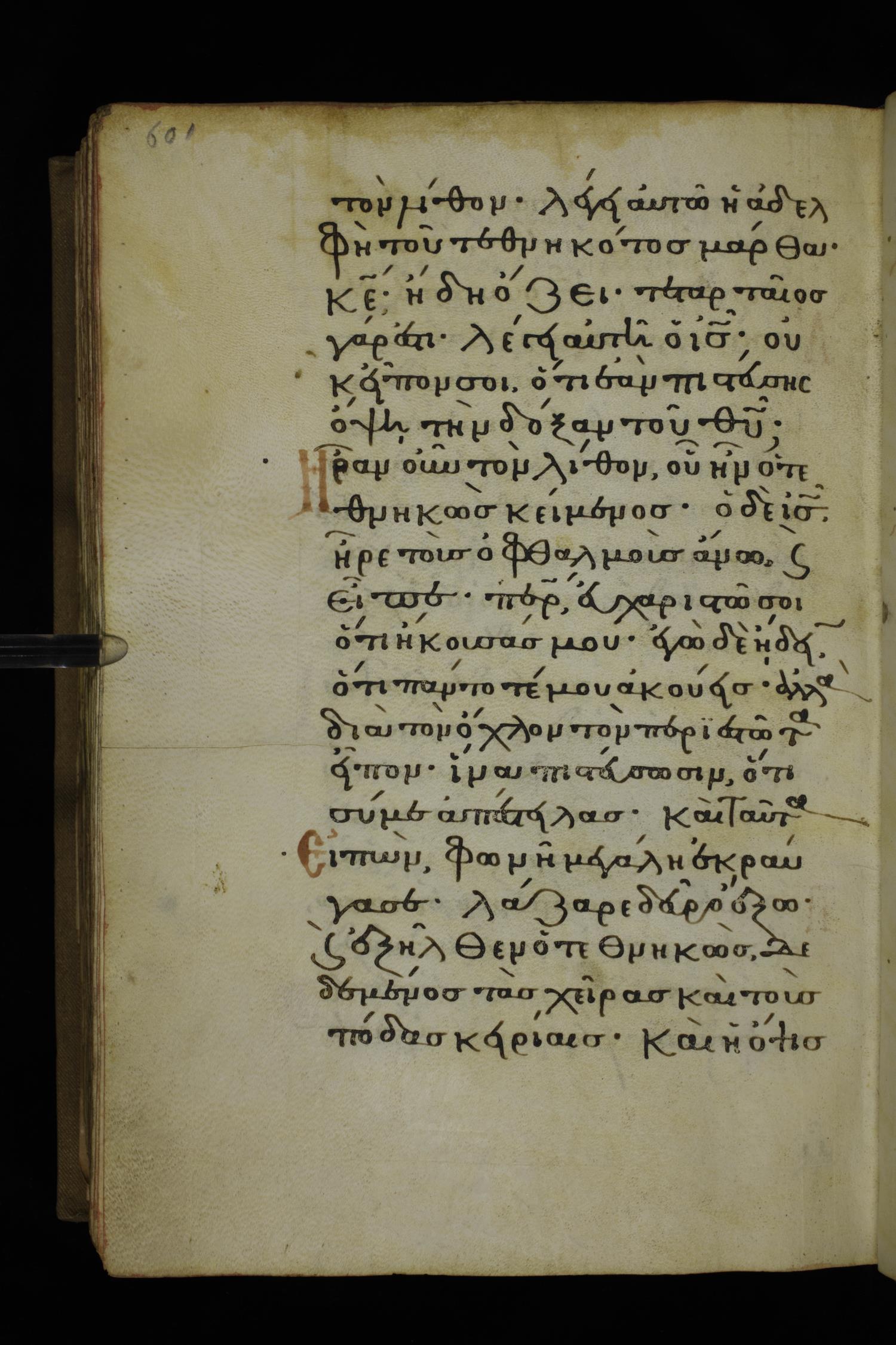 Fourteenth century minuscule of the Gospels on parchment; 332 leaves, 1 column, 20-22 lines per column. Images were taken at the National Library of Greece in Athens.