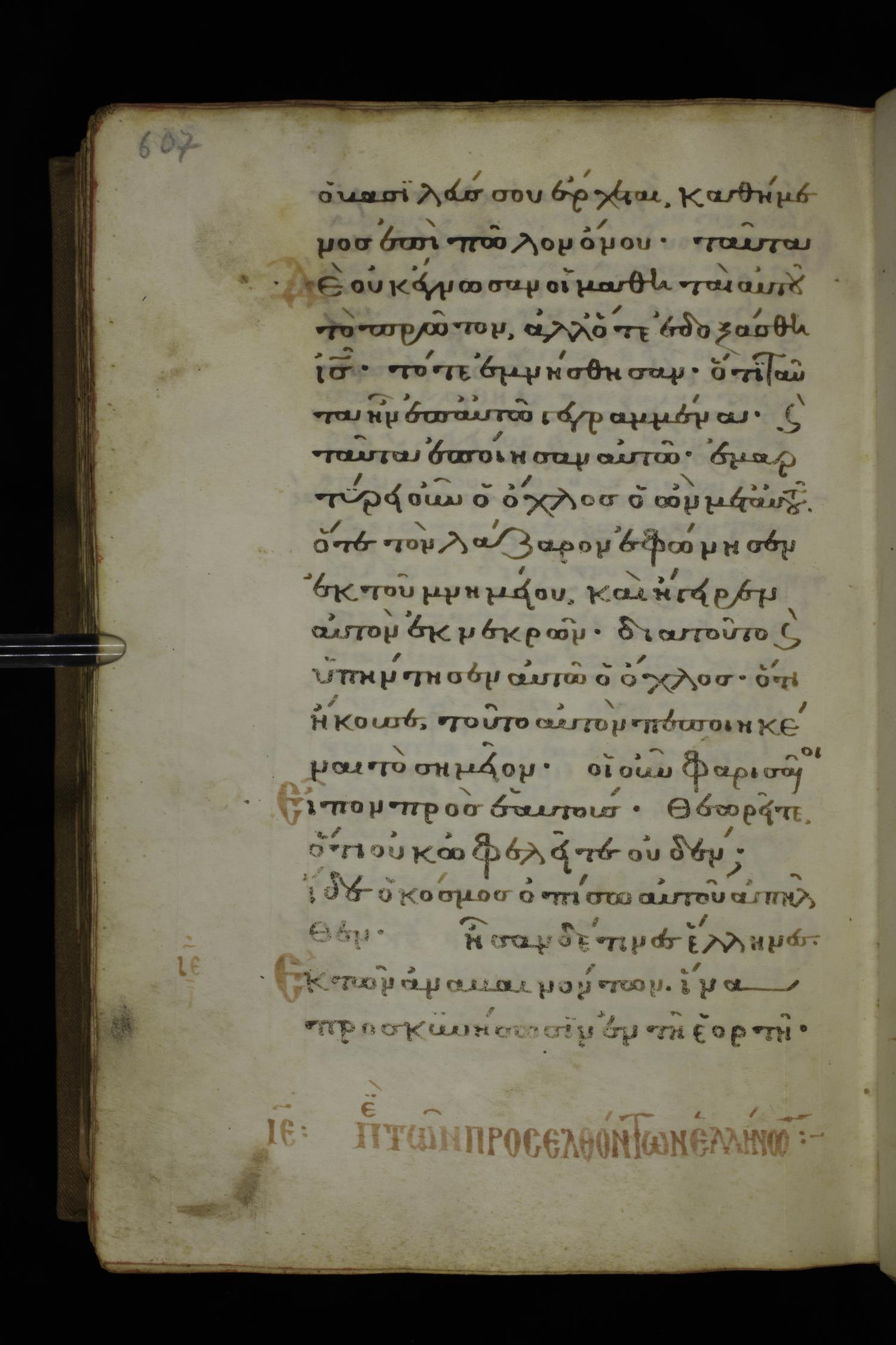 Fourteenth century minuscule of the Gospels on parchment; 332 leaves, 1 column, 20-22 lines per column. Images were taken at the National Library of Greece in Athens.