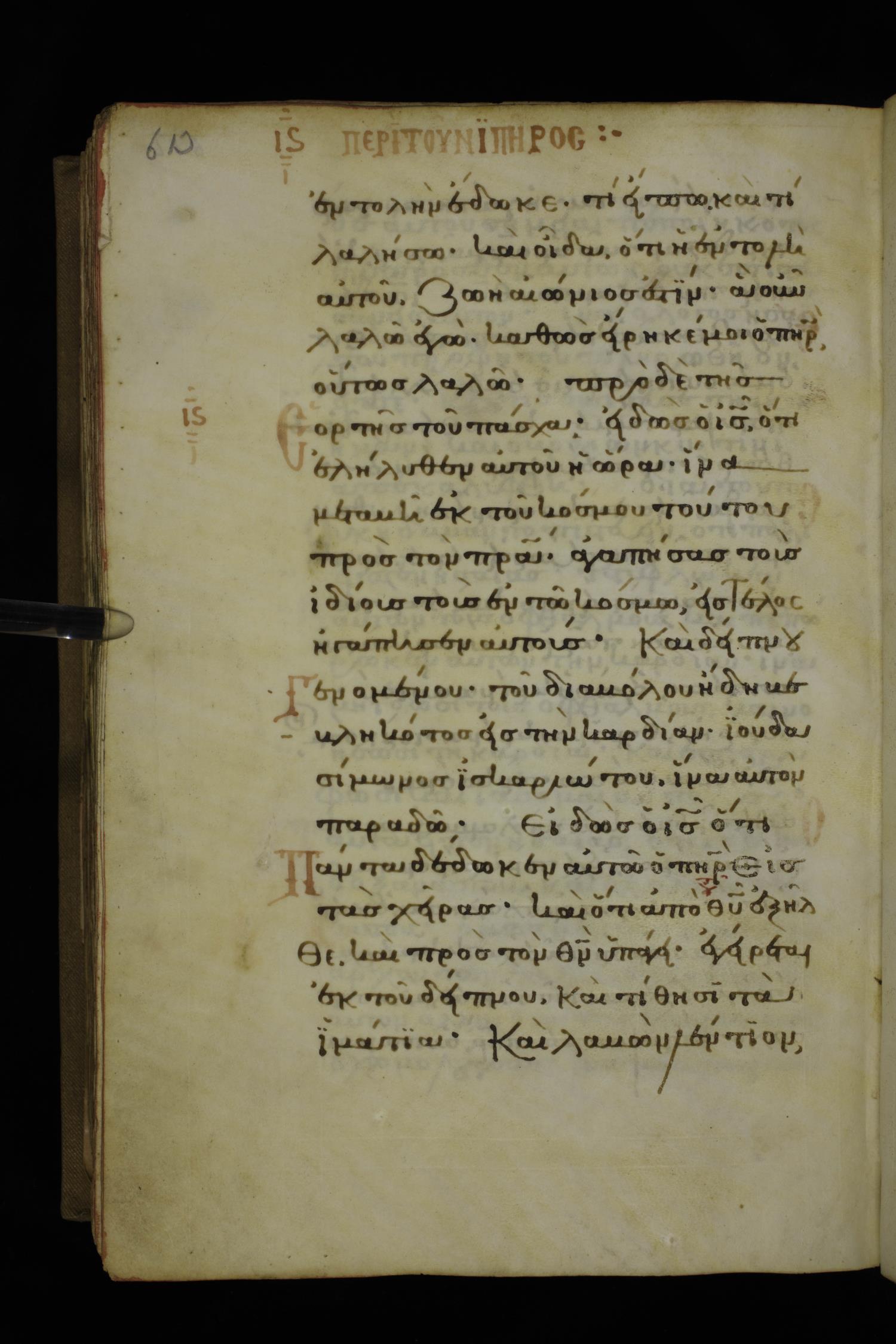 Fourteenth century minuscule of the Gospels on parchment; 332 leaves, 1 column, 20-22 lines per column. Images were taken at the National Library of Greece in Athens.
