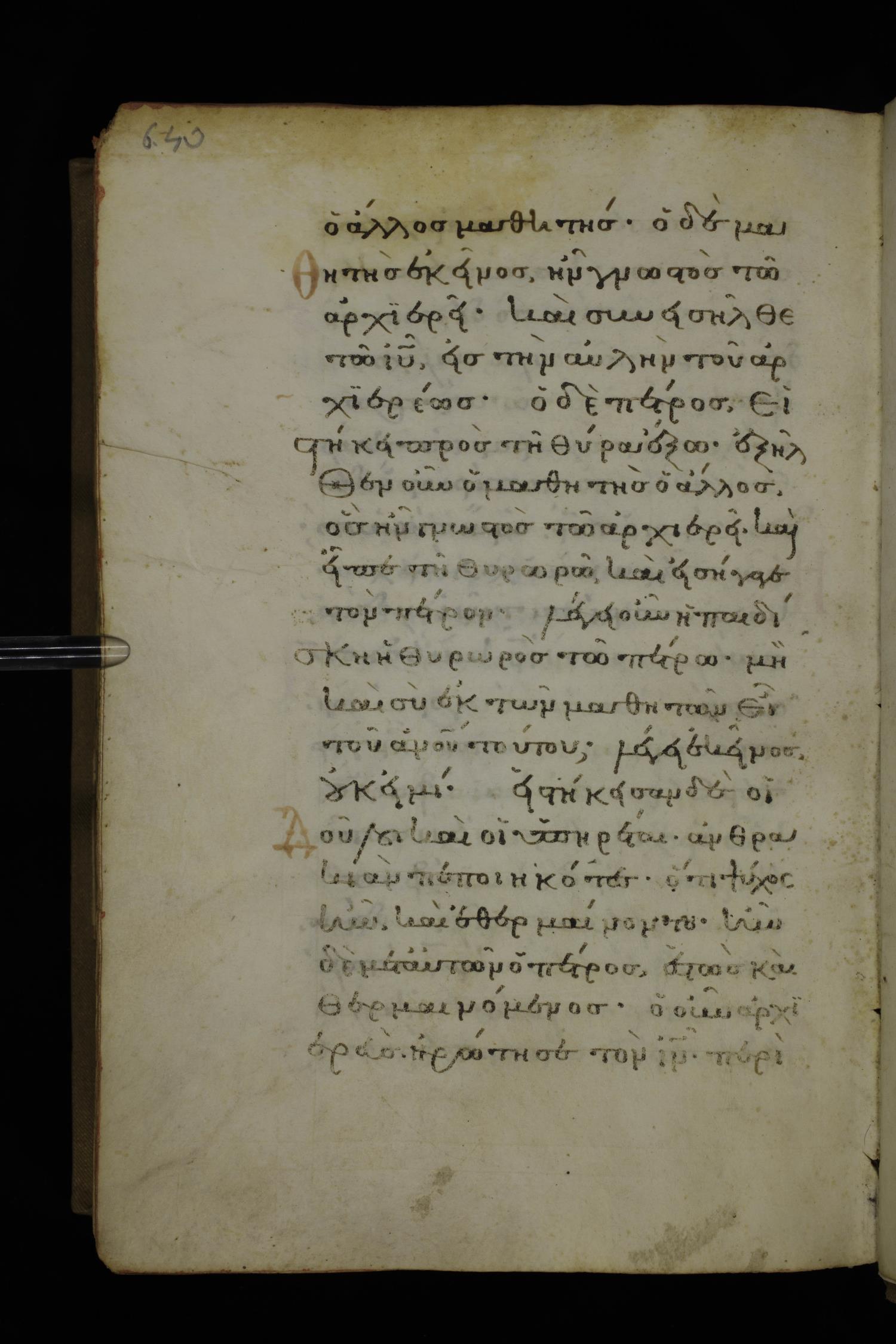 Fourteenth century minuscule of the Gospels on parchment; 332 leaves, 1 column, 20-22 lines per column. Images were taken at the National Library of Greece in Athens.