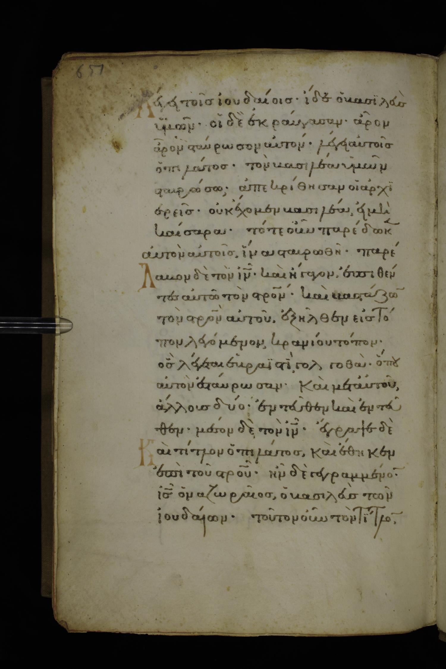 Fourteenth century minuscule of the Gospels on parchment; 332 leaves, 1 column, 20-22 lines per column. Images were taken at the National Library of Greece in Athens.