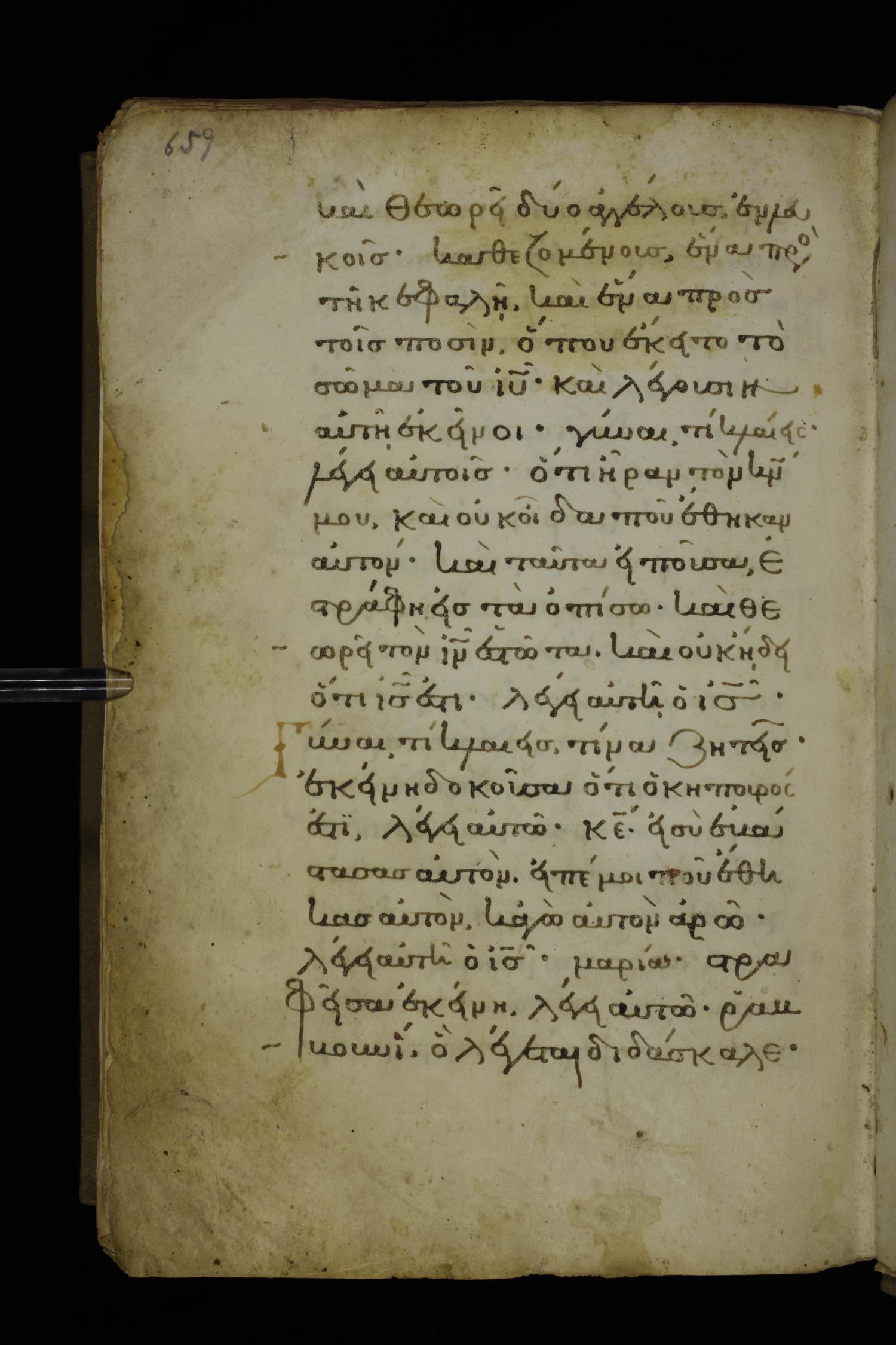 Fourteenth century minuscule of the Gospels on parchment; 332 leaves, 1 column, 20-22 lines per column. Images were taken at the National Library of Greece in Athens.