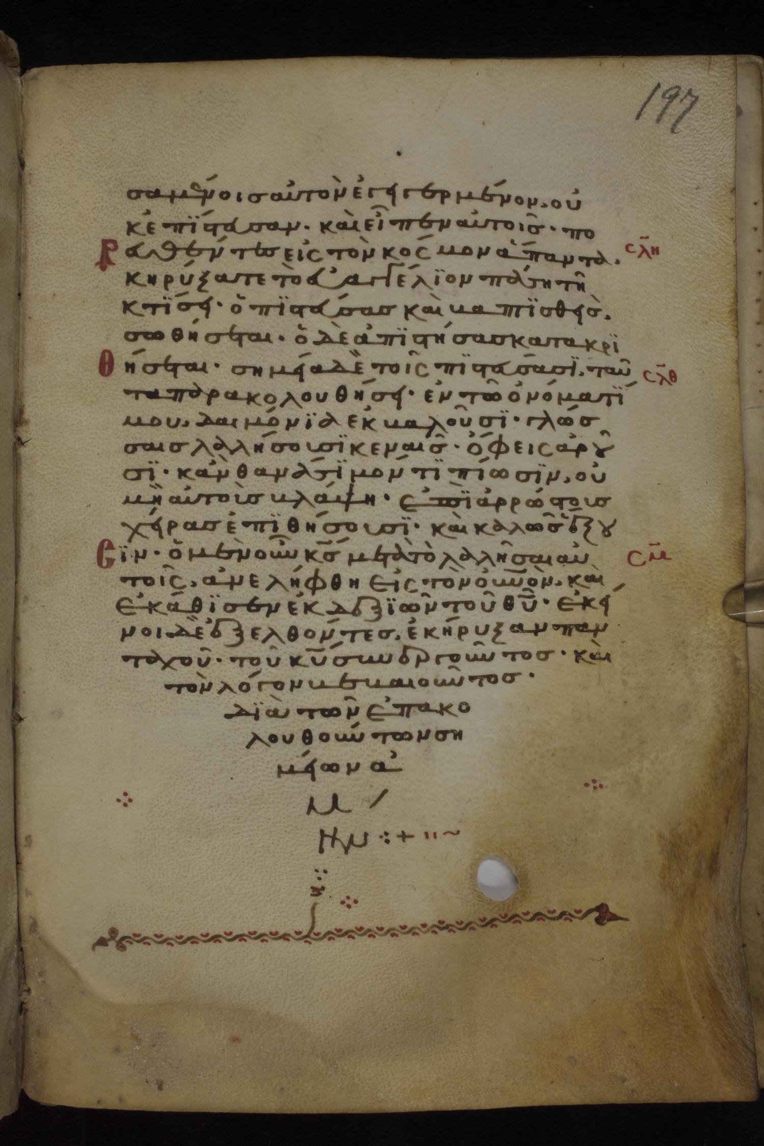 Twelfth century minuscule of the Gospels on parchment; 200 leaves, 1 column, 29-31 lines per column. Images were taken at the National Library of Greece in Athens.