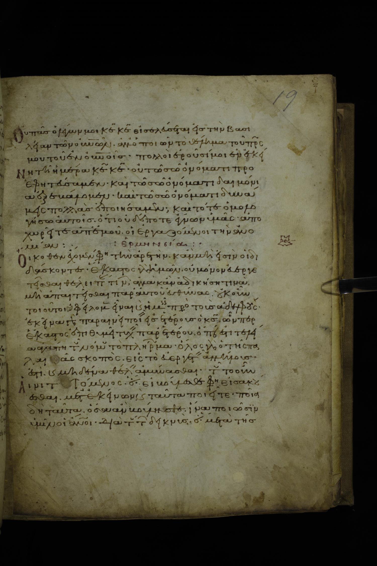 Twelfth century minuscule of the Gospels with commentary on parchment; 270 leaves, 1 column, 24-32 lines per column. Images were taken at the National Library of Greece in Athens.