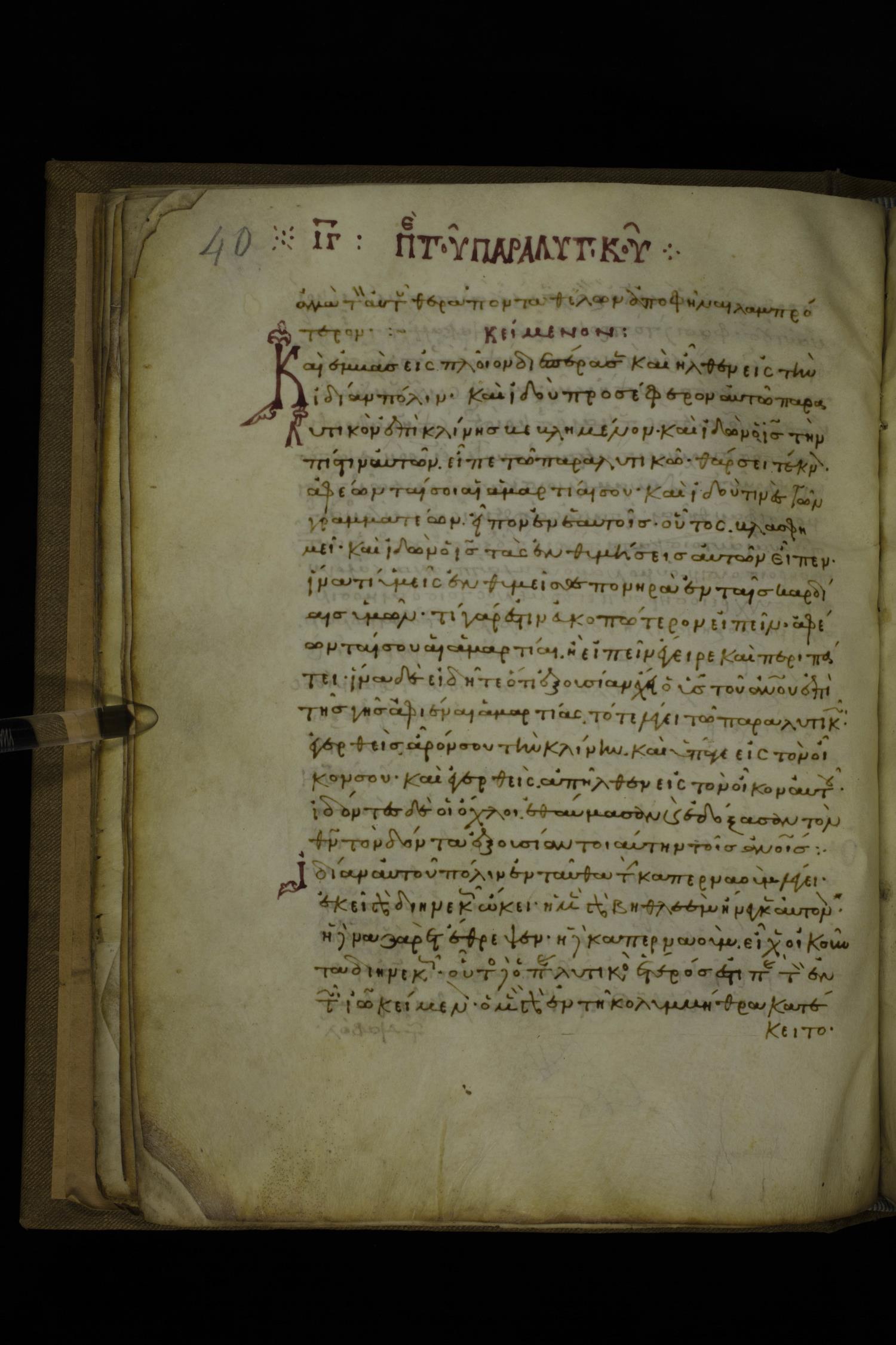 Twelfth century minuscule of the Gospels with commentary on parchment; 270 leaves, 1 column, 24-32 lines per column. Images were taken at the National Library of Greece in Athens.