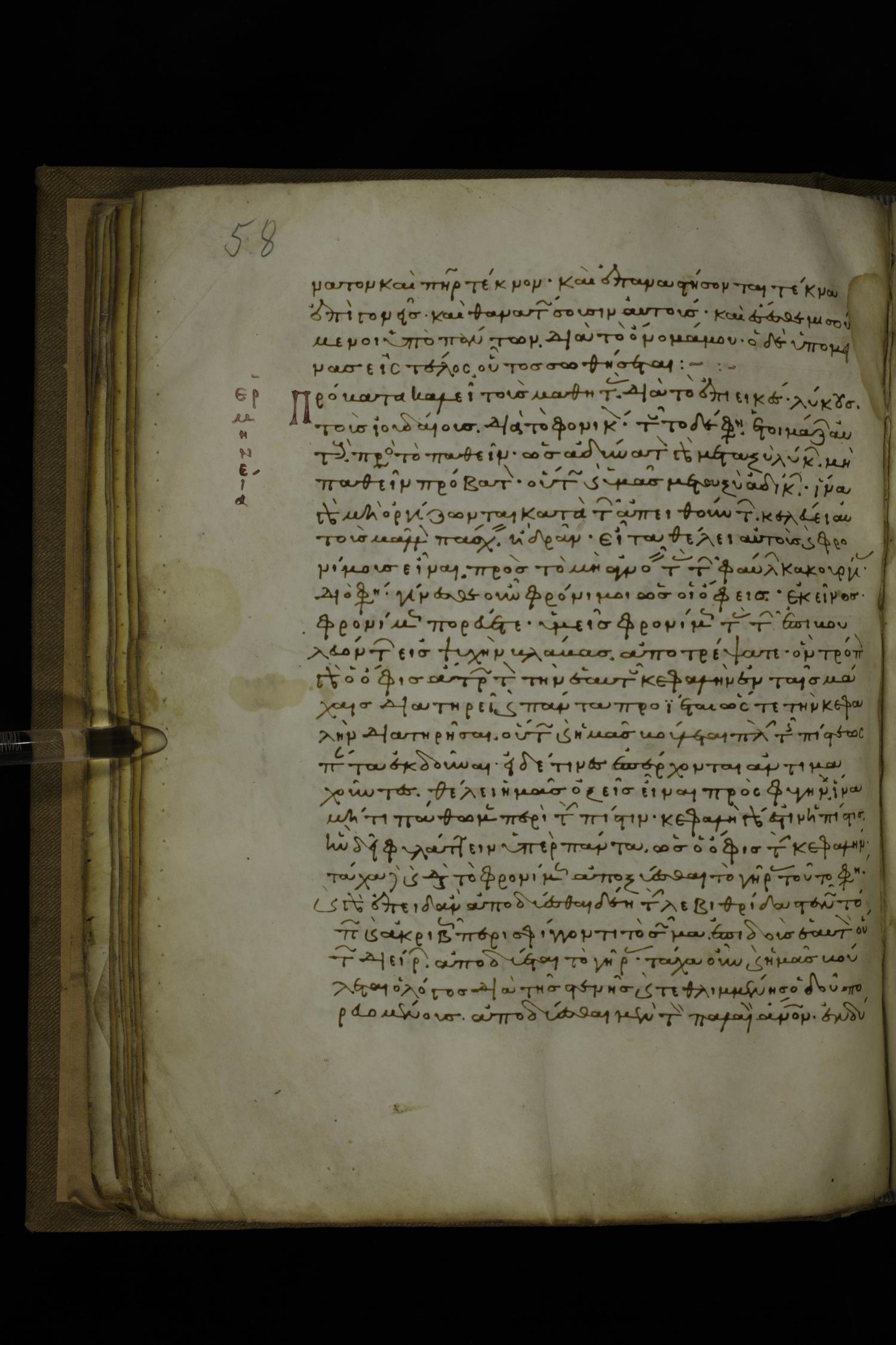 Twelfth century minuscule of the Gospels with commentary on parchment; 270 leaves, 1 column, 24-32 lines per column. Images were taken at the National Library of Greece in Athens.