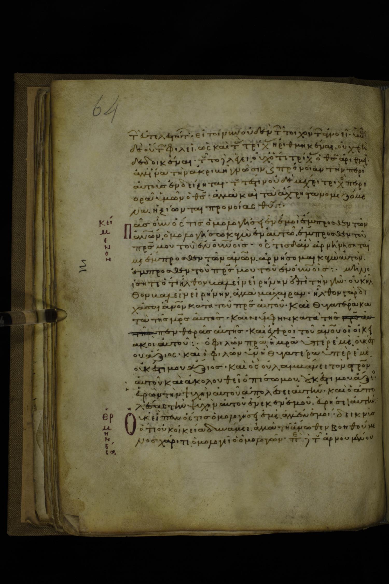 Twelfth century minuscule of the Gospels with commentary on parchment; 270 leaves, 1 column, 24-32 lines per column. Images were taken at the National Library of Greece in Athens.