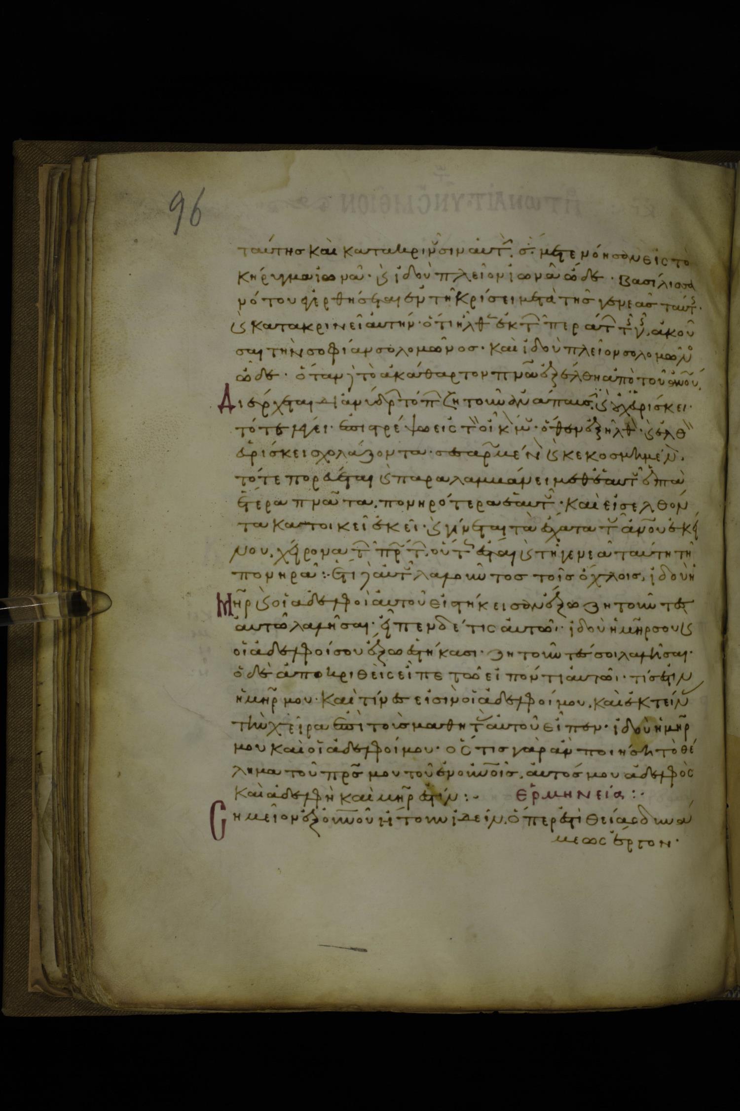 Twelfth century minuscule of the Gospels with commentary on parchment; 270 leaves, 1 column, 24-32 lines per column. Images were taken at the National Library of Greece in Athens.