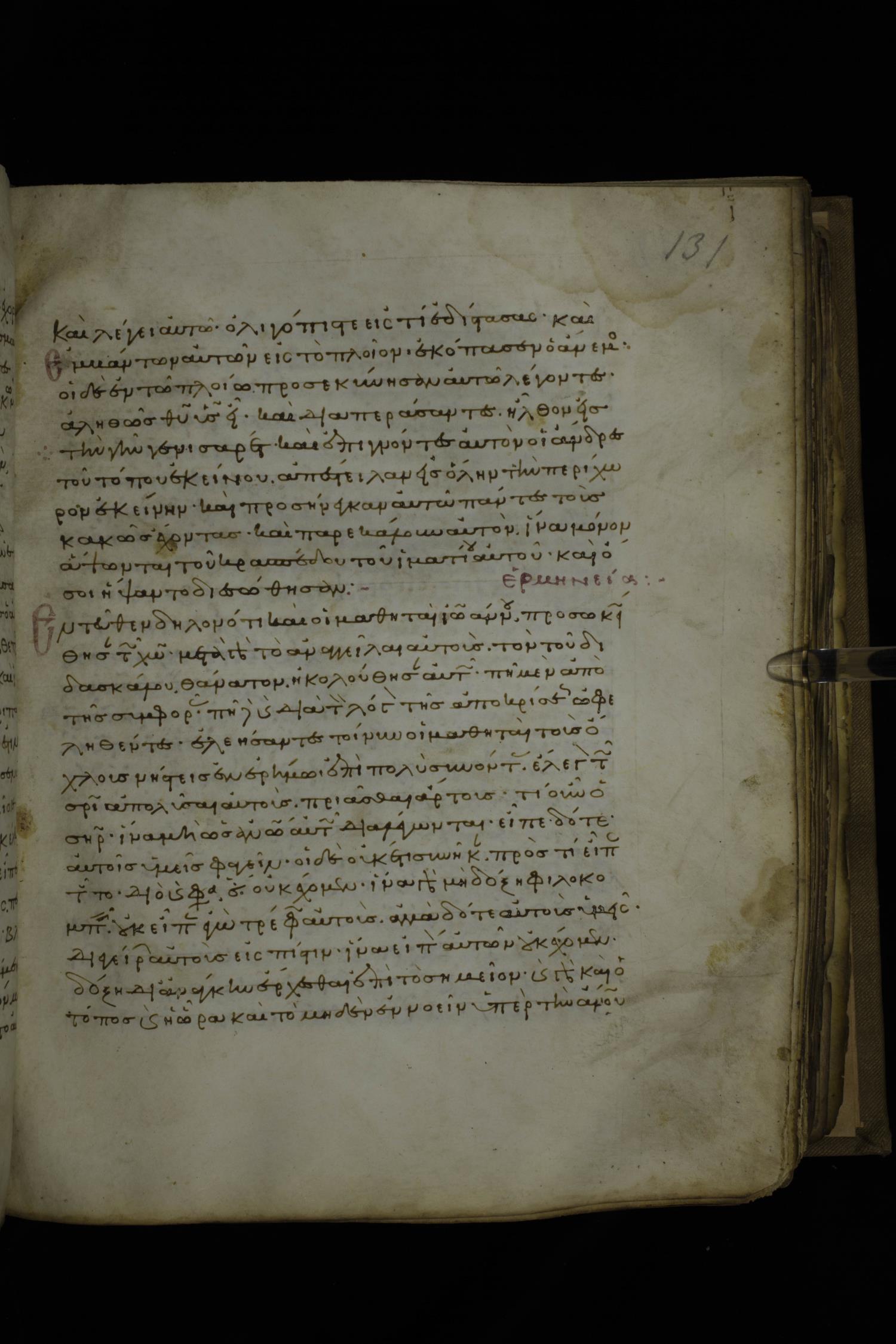 Twelfth century minuscule of the Gospels with commentary on parchment; 270 leaves, 1 column, 24-32 lines per column. Images were taken at the National Library of Greece in Athens.