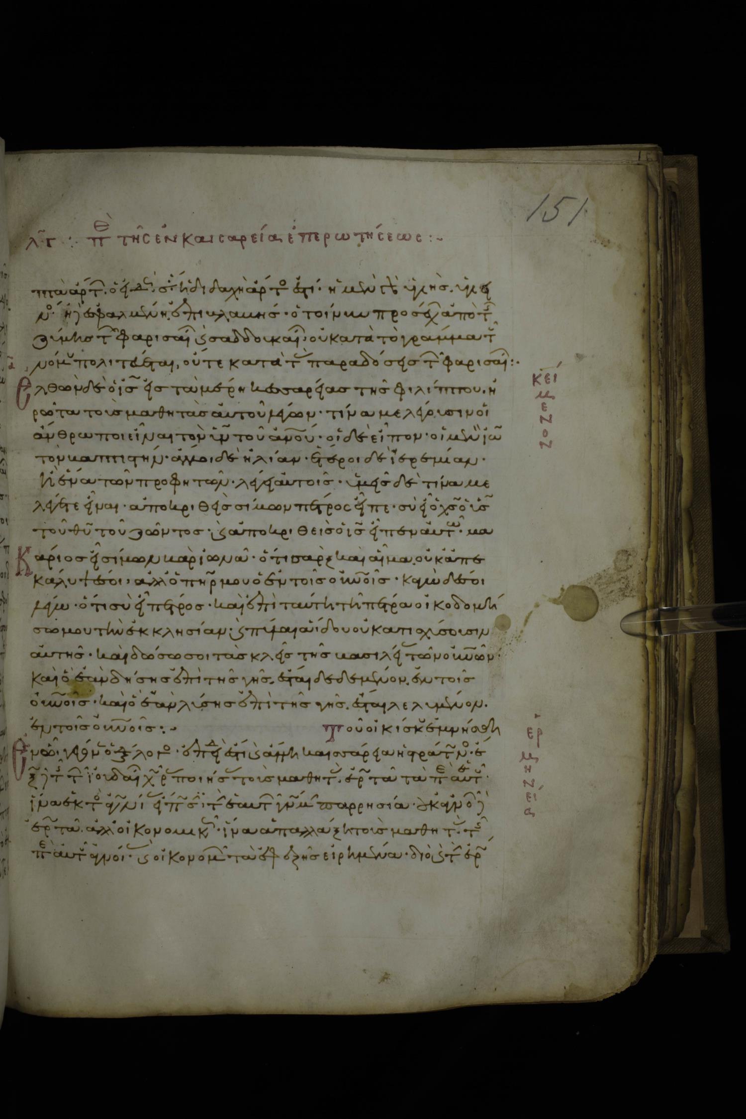 Twelfth century minuscule of the Gospels with commentary on parchment; 270 leaves, 1 column, 24-32 lines per column. Images were taken at the National Library of Greece in Athens.