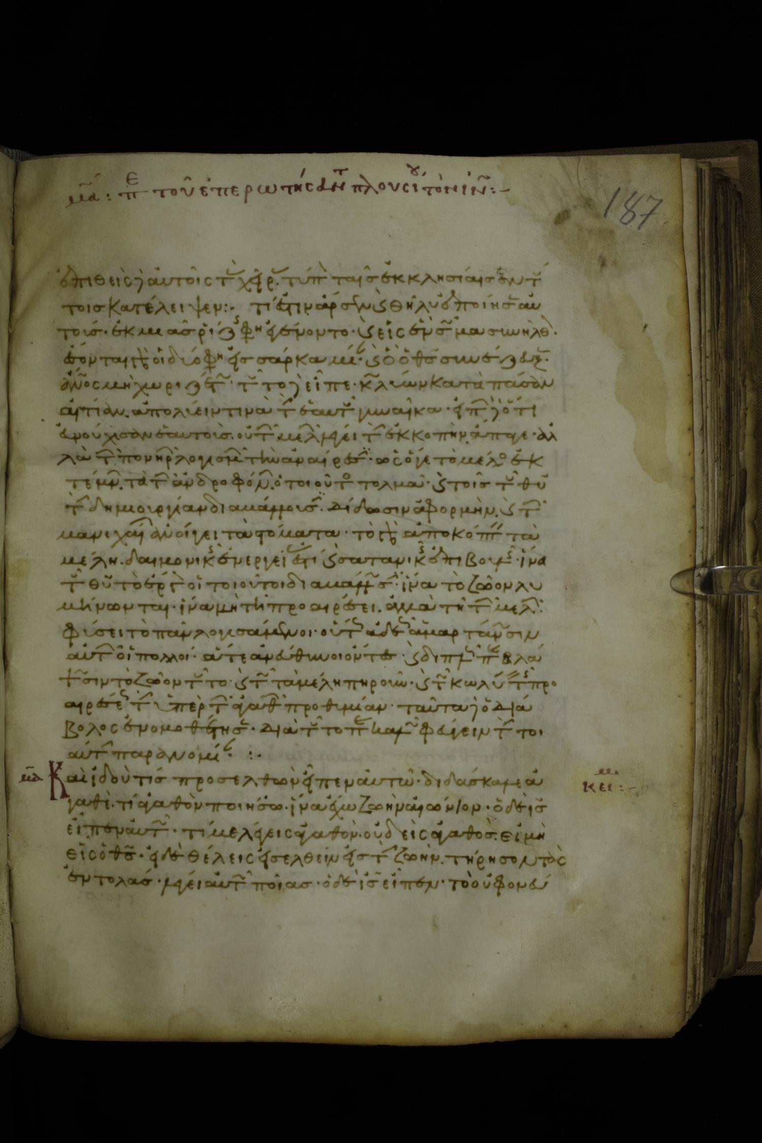 Twelfth century minuscule of the Gospels with commentary on parchment; 270 leaves, 1 column, 24-32 lines per column. Images were taken at the National Library of Greece in Athens.