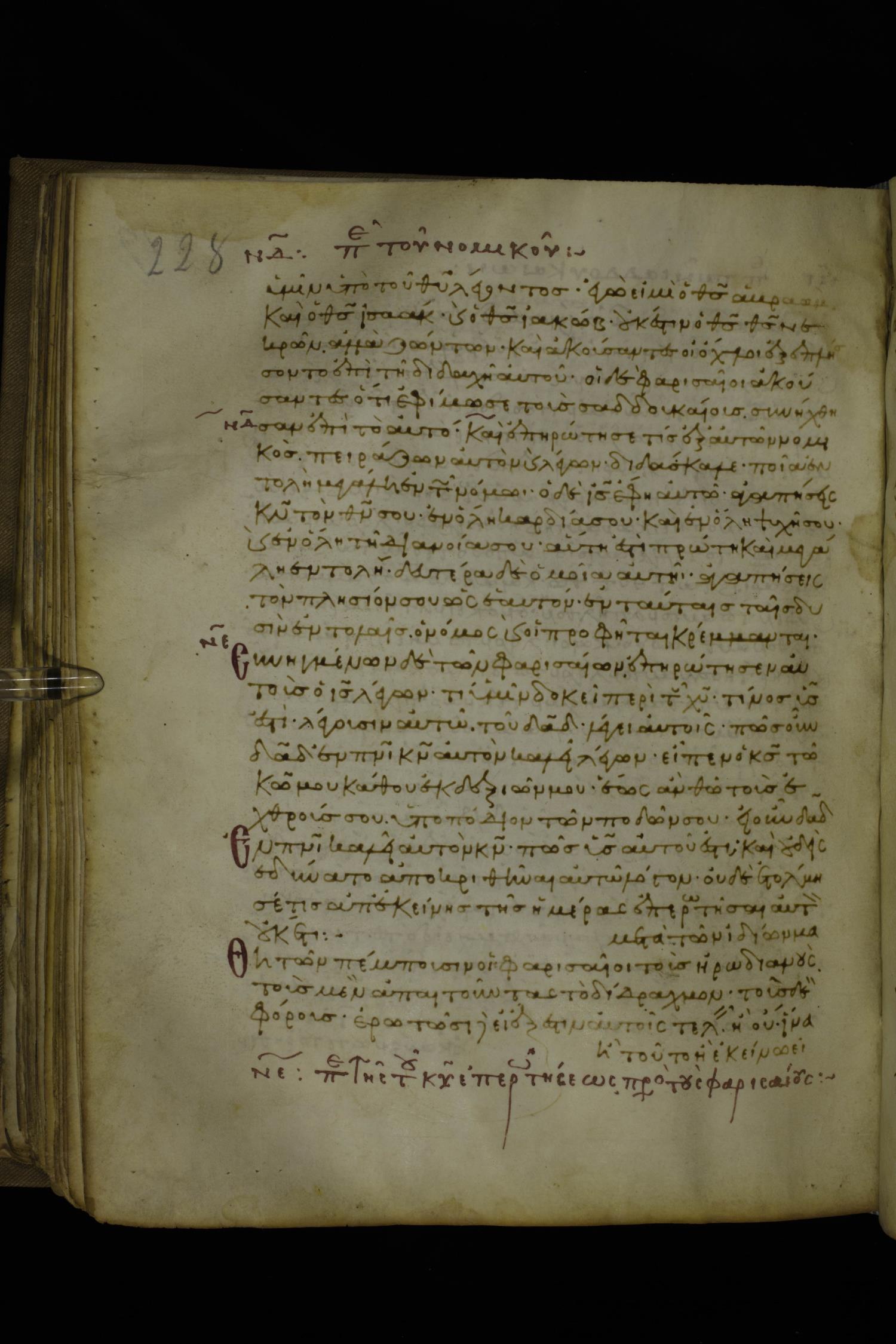 Twelfth century minuscule of the Gospels with commentary on parchment; 270 leaves, 1 column, 24-32 lines per column. Images were taken at the National Library of Greece in Athens.