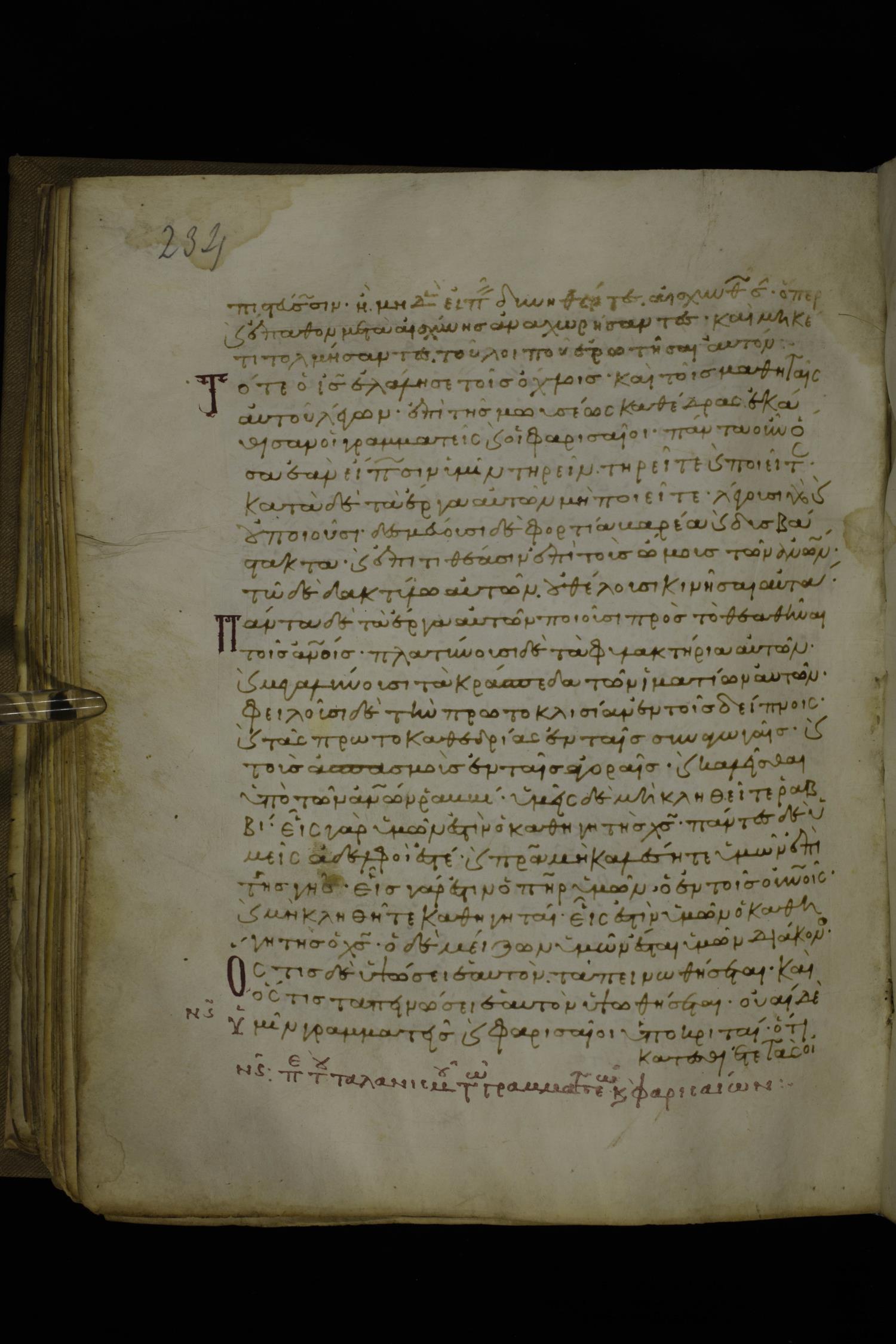 Twelfth century minuscule of the Gospels with commentary on parchment; 270 leaves, 1 column, 24-32 lines per column. Images were taken at the National Library of Greece in Athens.