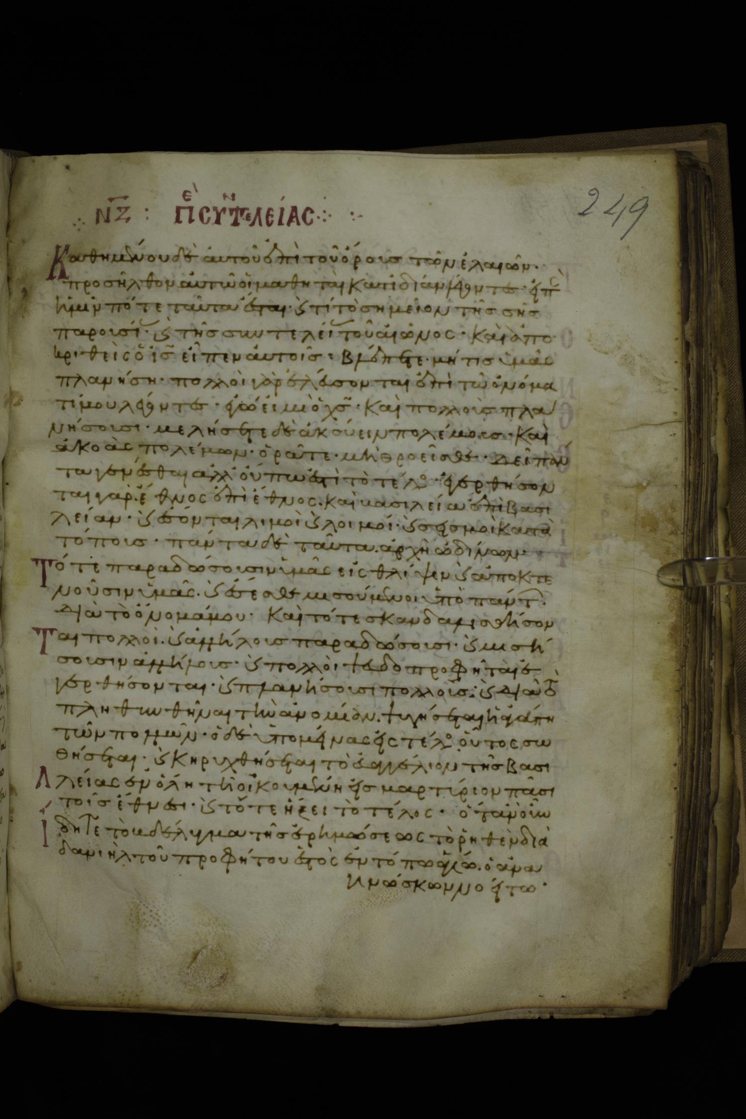 Twelfth century minuscule of the Gospels with commentary on parchment; 270 leaves, 1 column, 24-32 lines per column. Images were taken at the National Library of Greece in Athens.