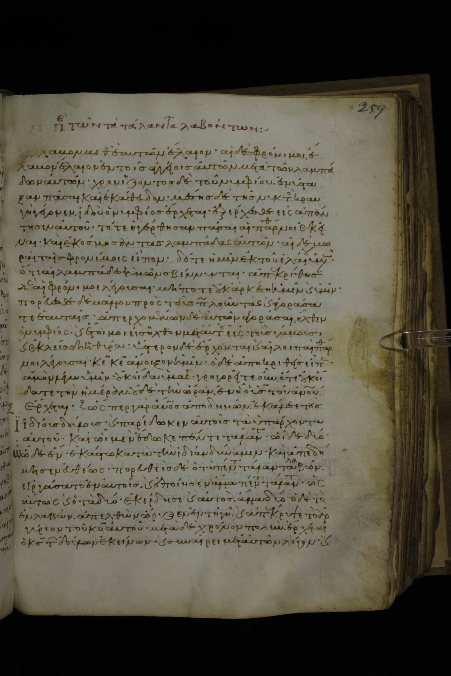 Twelfth century minuscule of the Gospels with commentary on parchment; 270 leaves, 1 column, 24-32 lines per column. Images were taken at the National Library of Greece in Athens.