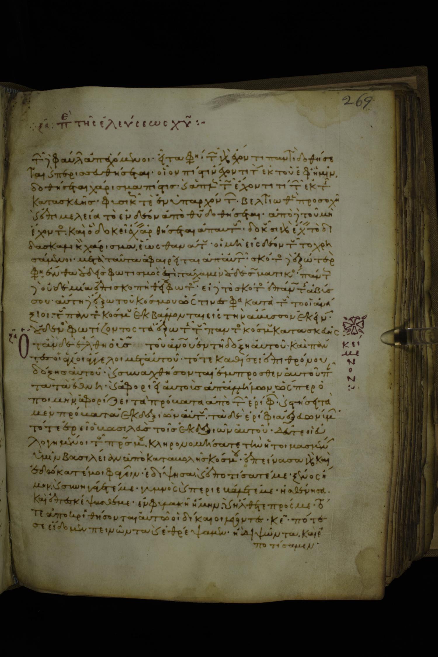 Twelfth century minuscule of the Gospels with commentary on parchment; 270 leaves, 1 column, 24-32 lines per column. Images were taken at the National Library of Greece in Athens.