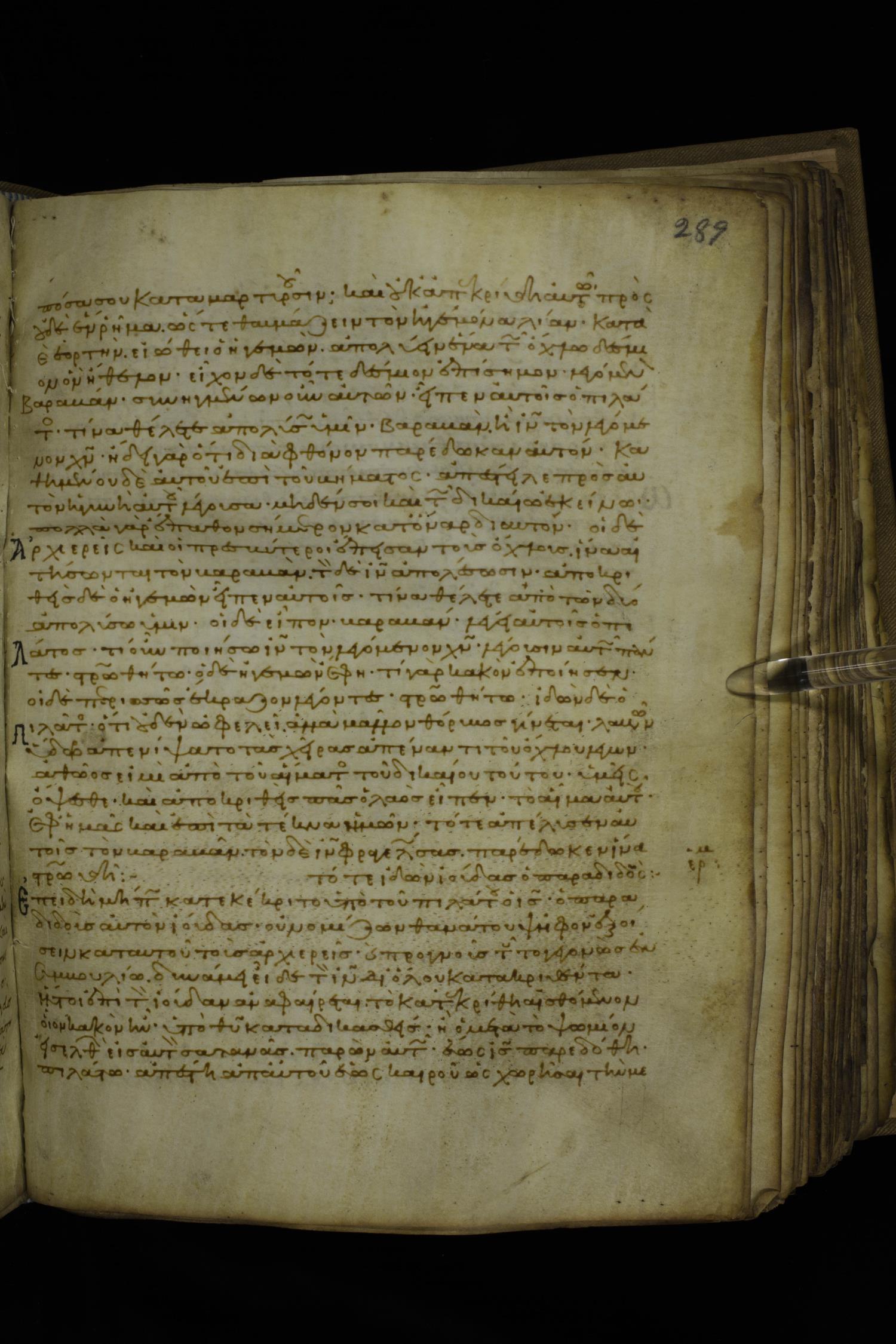 Twelfth century minuscule of the Gospels with commentary on parchment; 270 leaves, 1 column, 24-32 lines per column. Images were taken at the National Library of Greece in Athens.
