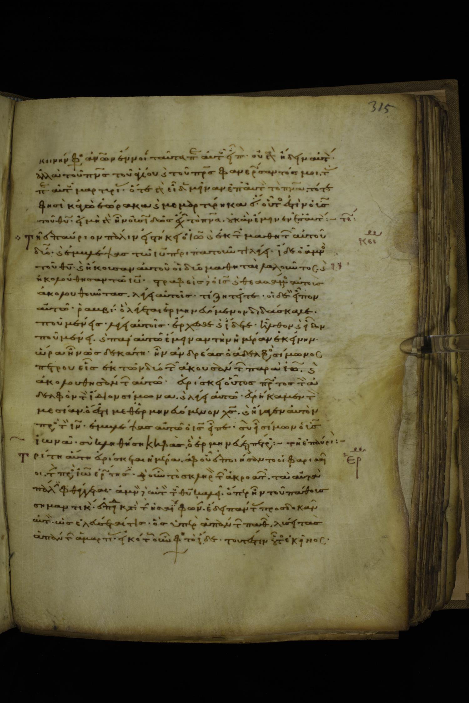 Twelfth century minuscule of the Gospels with commentary on parchment; 270 leaves, 1 column, 24-32 lines per column. Images were taken at the National Library of Greece in Athens.