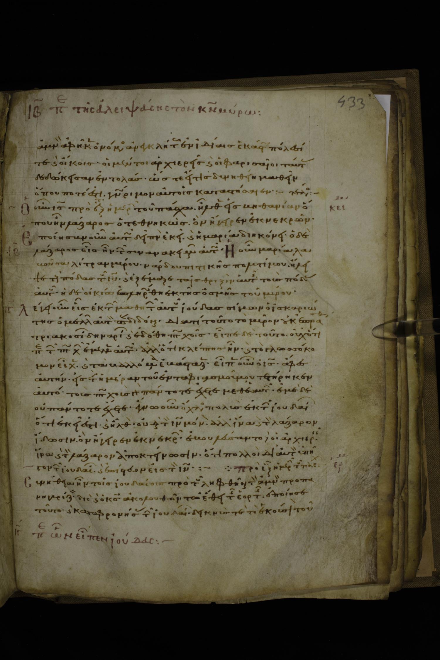 Twelfth century minuscule of the Gospels with commentary on parchment; 270 leaves, 1 column, 24-32 lines per column. Images were taken at the National Library of Greece in Athens.