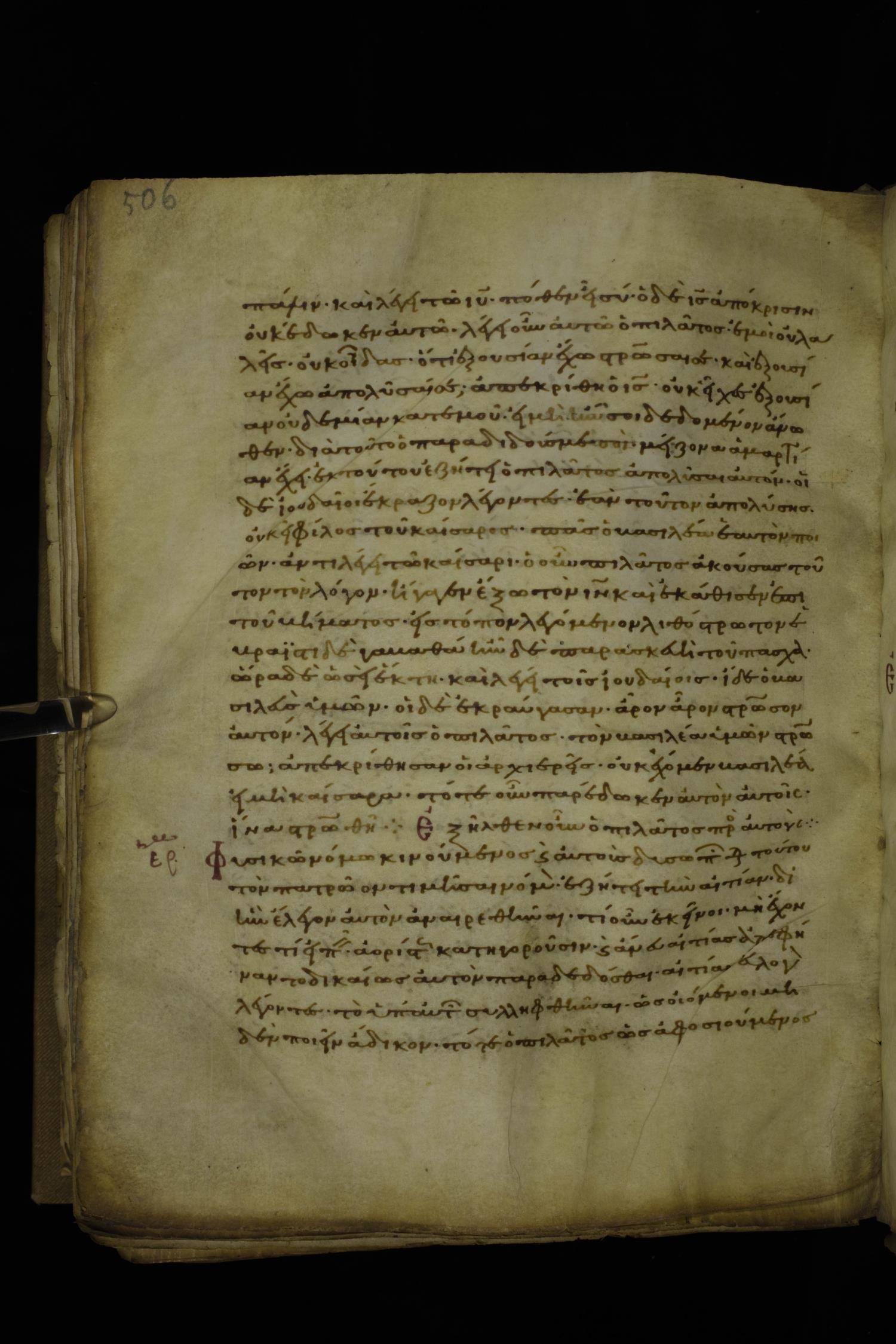 Twelfth century minuscule of the Gospels with commentary on parchment; 270 leaves, 1 column, 24-32 lines per column. Images were taken at the National Library of Greece in Athens.