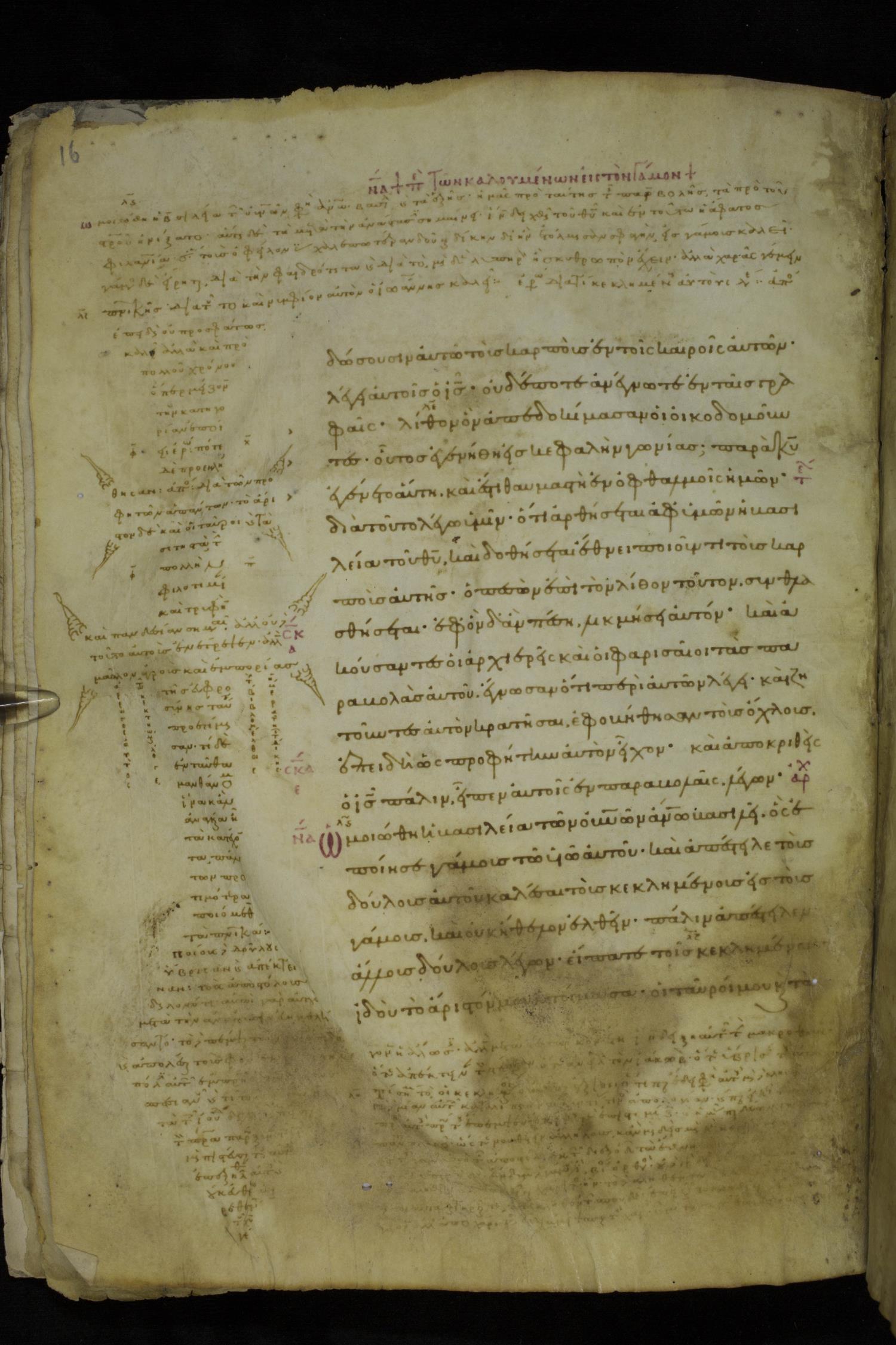 Tenth century minuscule of the Gospels with commentary on parchment; 153 leaves, 1 column, 20 lines per page. Images were taken at the National Library of Greece in Athens.