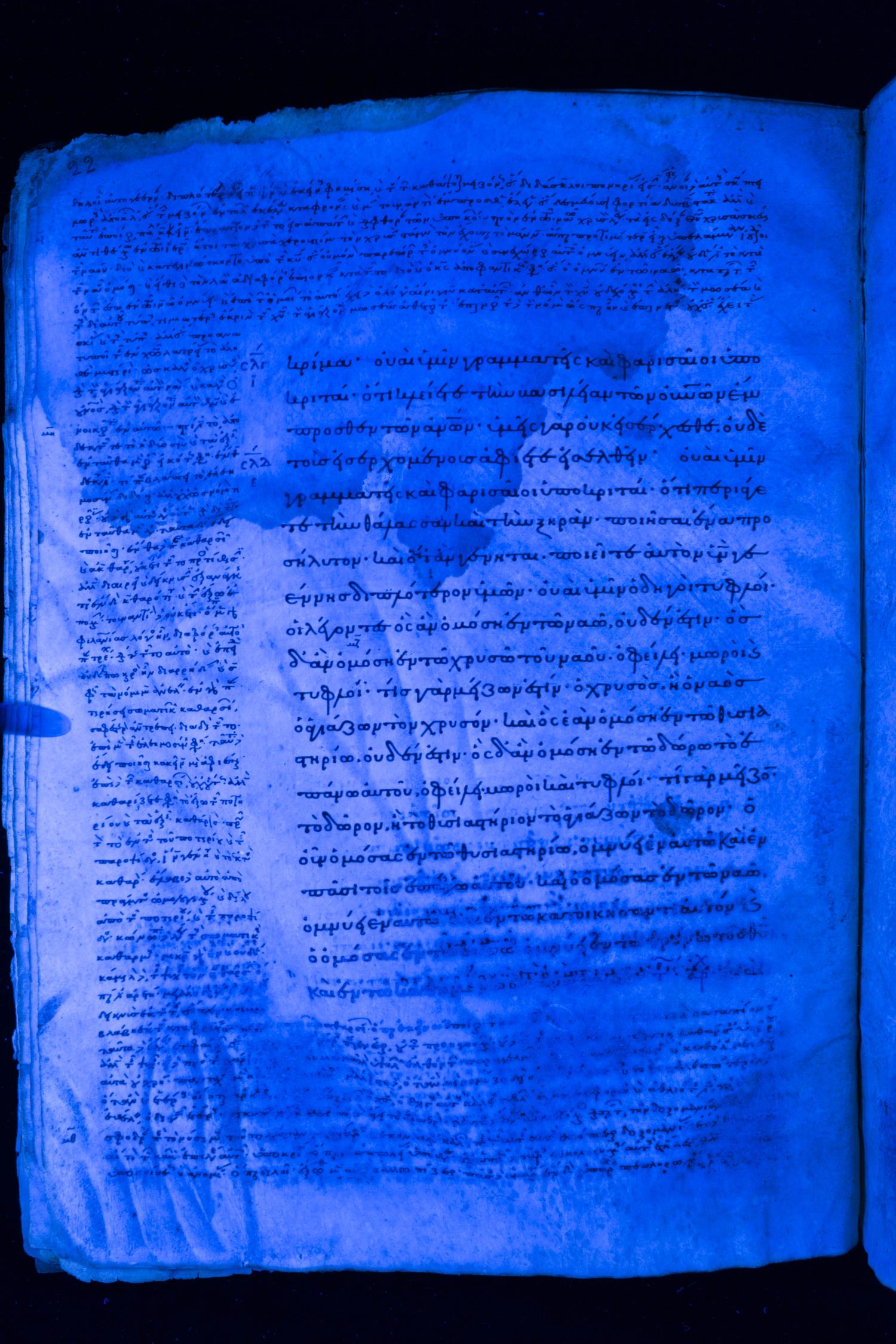 Tenth century minuscule of the Gospels with commentary on parchment; 153 leaves, 1 column, 20 lines per page. Images were taken at the National Library of Greece in Athens.