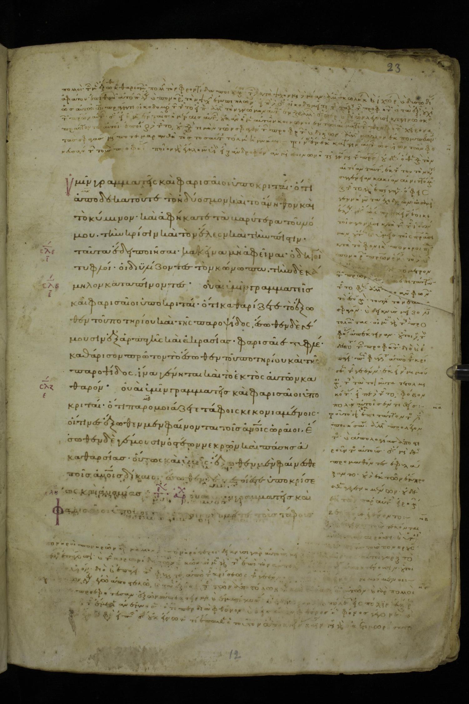 Tenth century minuscule of the Gospels with commentary on parchment; 153 leaves, 1 column, 20 lines per page. Images were taken at the National Library of Greece in Athens.