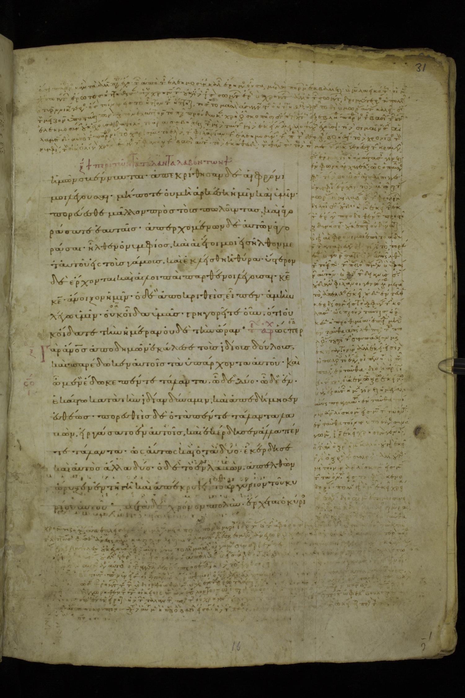 Tenth century minuscule of the Gospels with commentary on parchment; 153 leaves, 1 column, 20 lines per page. Images were taken at the National Library of Greece in Athens.