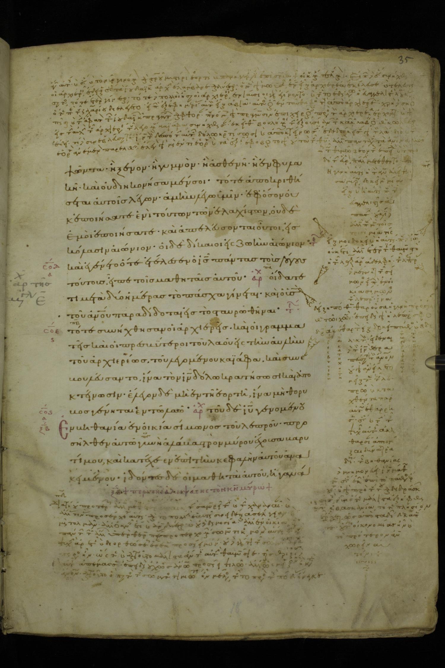 Tenth century minuscule of the Gospels with commentary on parchment; 153 leaves, 1 column, 20 lines per page. Images were taken at the National Library of Greece in Athens.