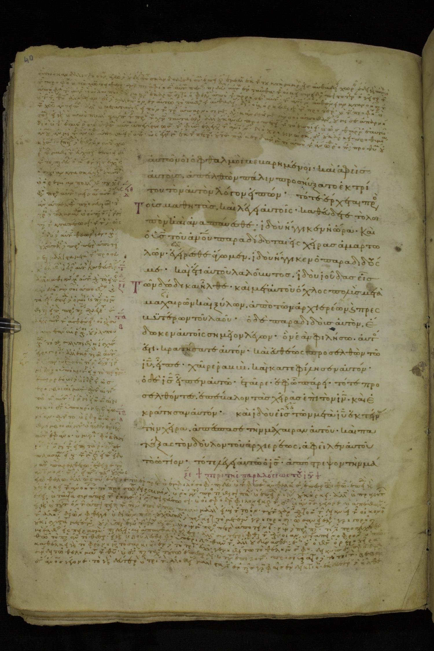 Tenth century minuscule of the Gospels with commentary on parchment; 153 leaves, 1 column, 20 lines per page. Images were taken at the National Library of Greece in Athens.