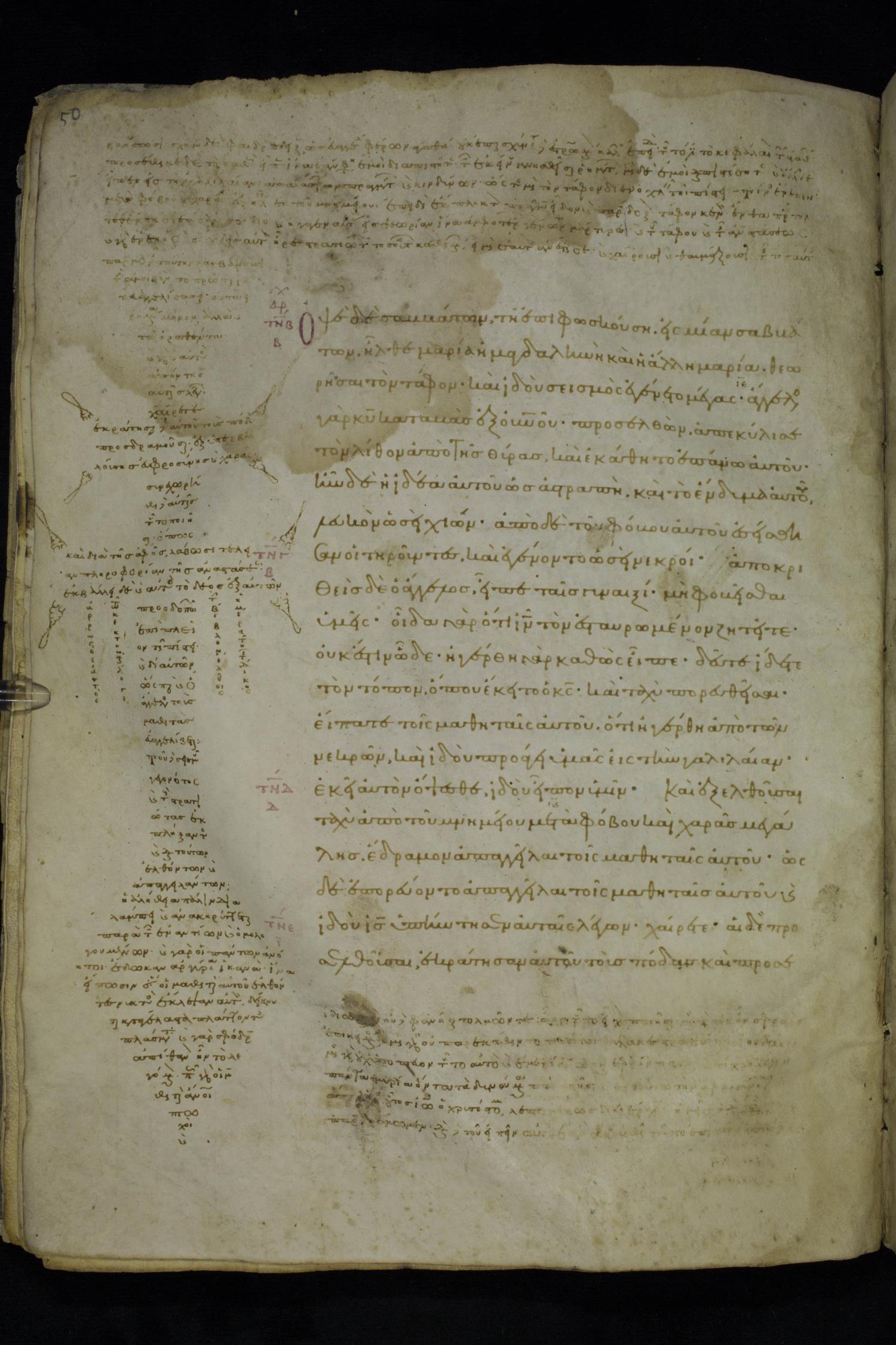 Tenth century minuscule of the Gospels with commentary on parchment; 153 leaves, 1 column, 20 lines per page. Images were taken at the National Library of Greece in Athens.