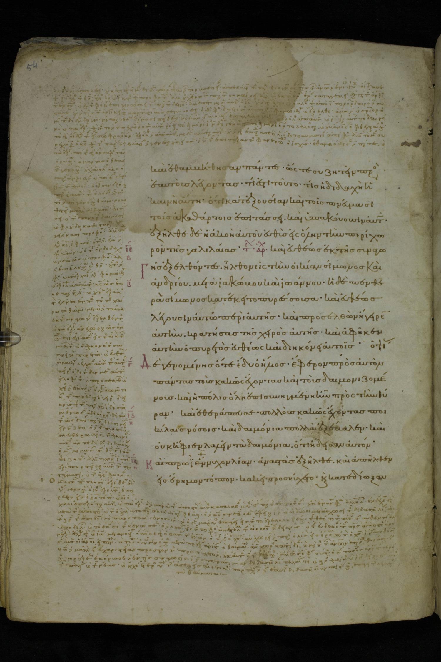 Tenth century minuscule of the Gospels with commentary on parchment; 153 leaves, 1 column, 20 lines per page. Images were taken at the National Library of Greece in Athens.