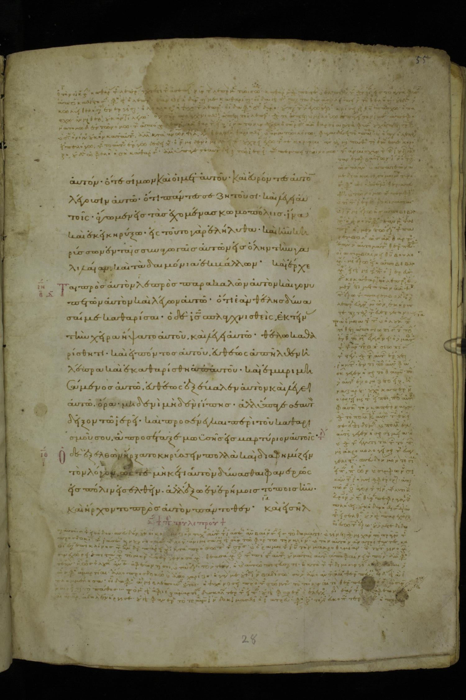 Tenth century minuscule of the Gospels with commentary on parchment; 153 leaves, 1 column, 20 lines per page. Images were taken at the National Library of Greece in Athens.