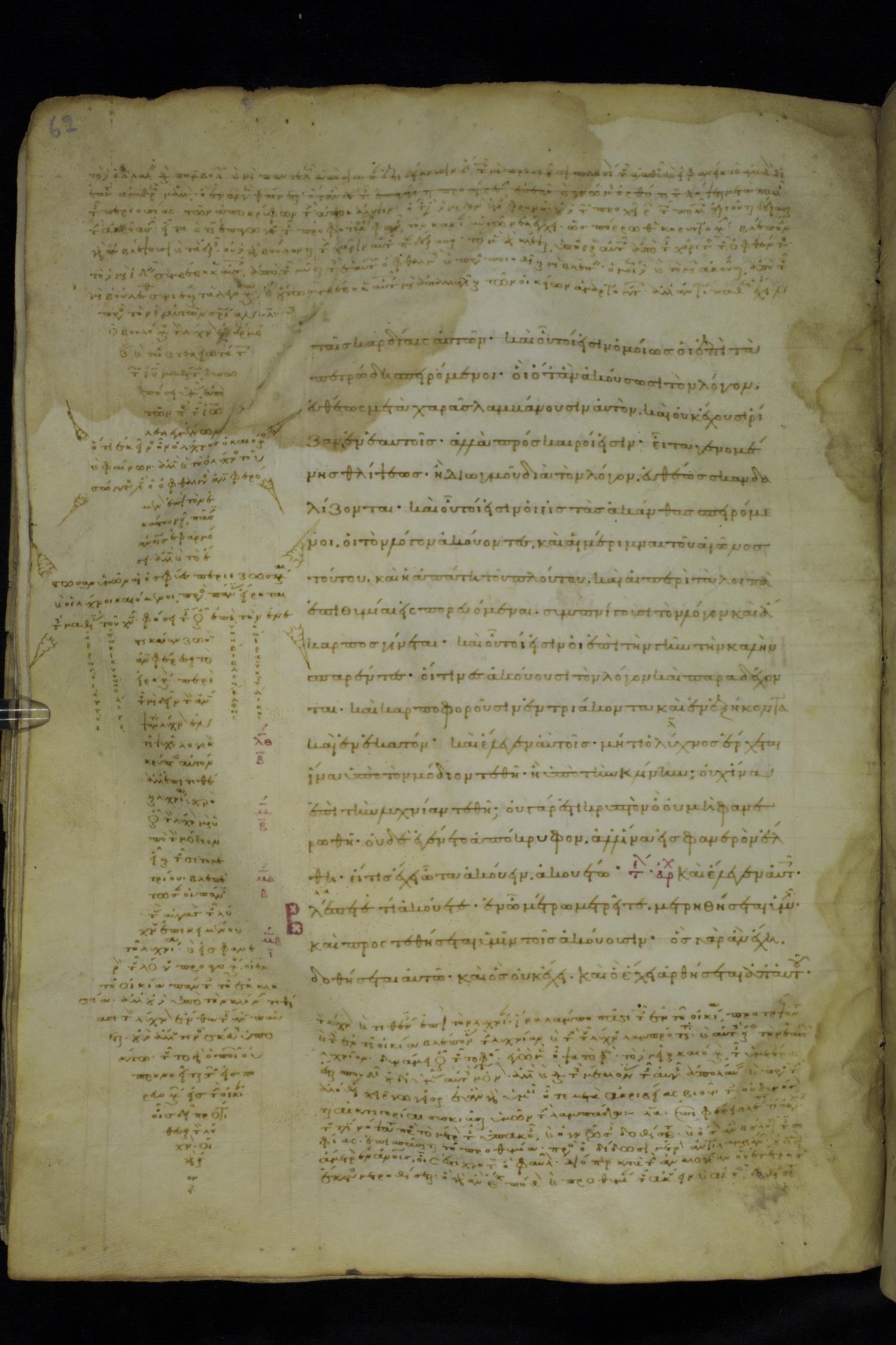 Tenth century minuscule of the Gospels with commentary on parchment; 153 leaves, 1 column, 20 lines per page. Images were taken at the National Library of Greece in Athens.
