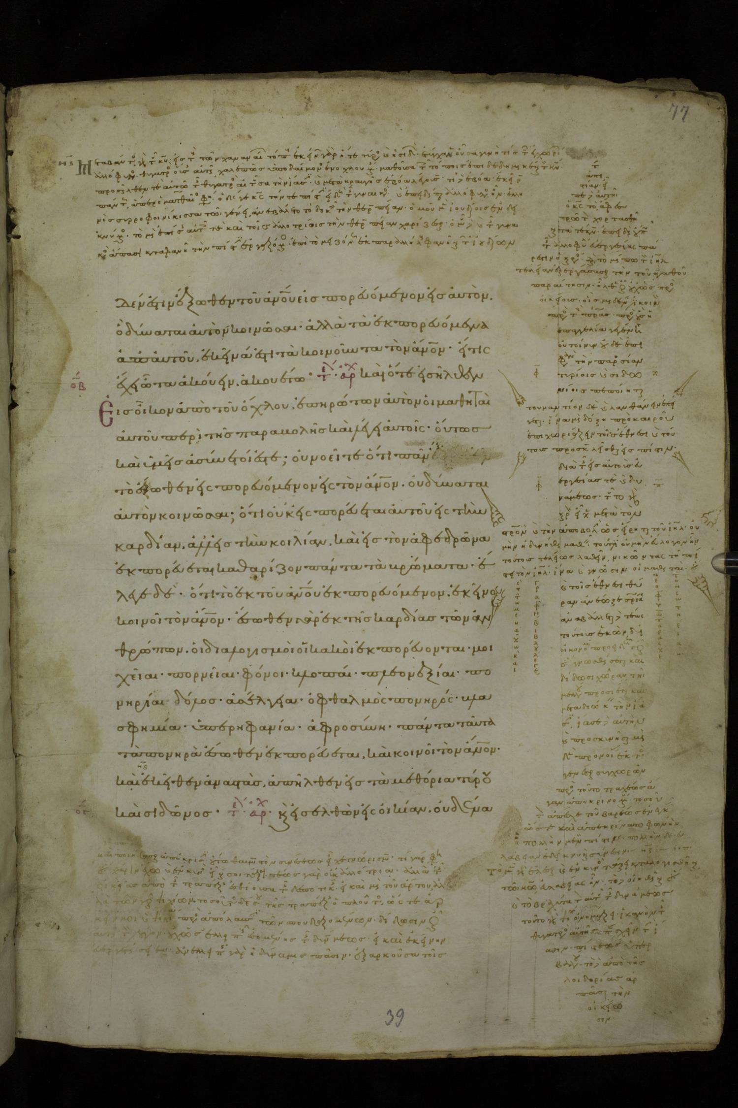 Tenth century minuscule of the Gospels with commentary on parchment; 153 leaves, 1 column, 20 lines per page. Images were taken at the National Library of Greece in Athens.