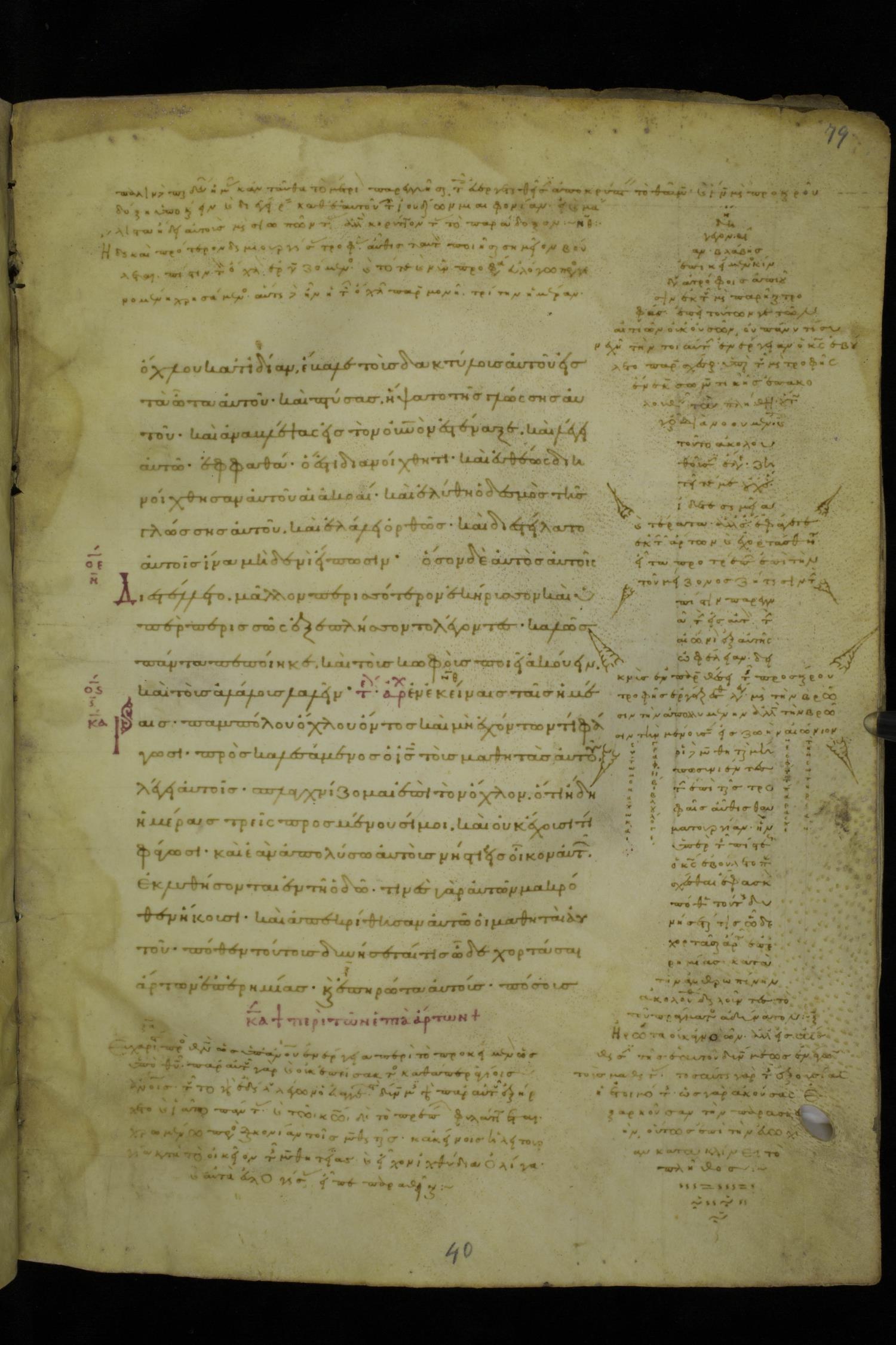 Tenth century minuscule of the Gospels with commentary on parchment; 153 leaves, 1 column, 20 lines per page. Images were taken at the National Library of Greece in Athens.
