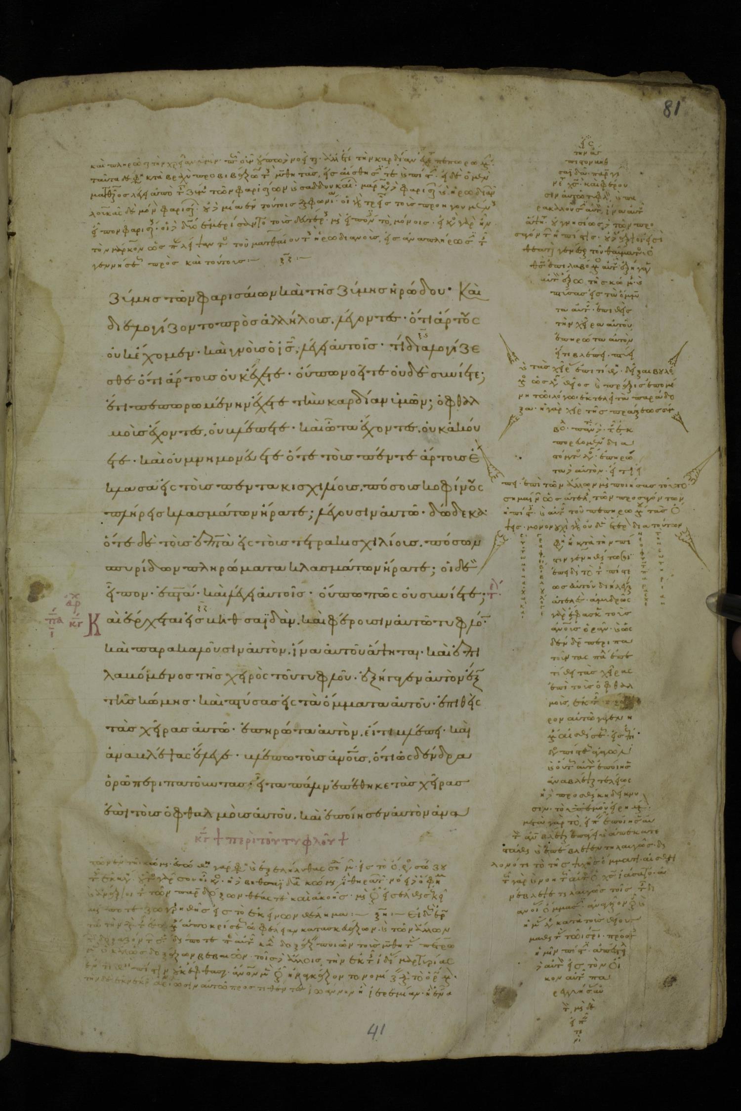 Tenth century minuscule of the Gospels with commentary on parchment; 153 leaves, 1 column, 20 lines per page. Images were taken at the National Library of Greece in Athens.