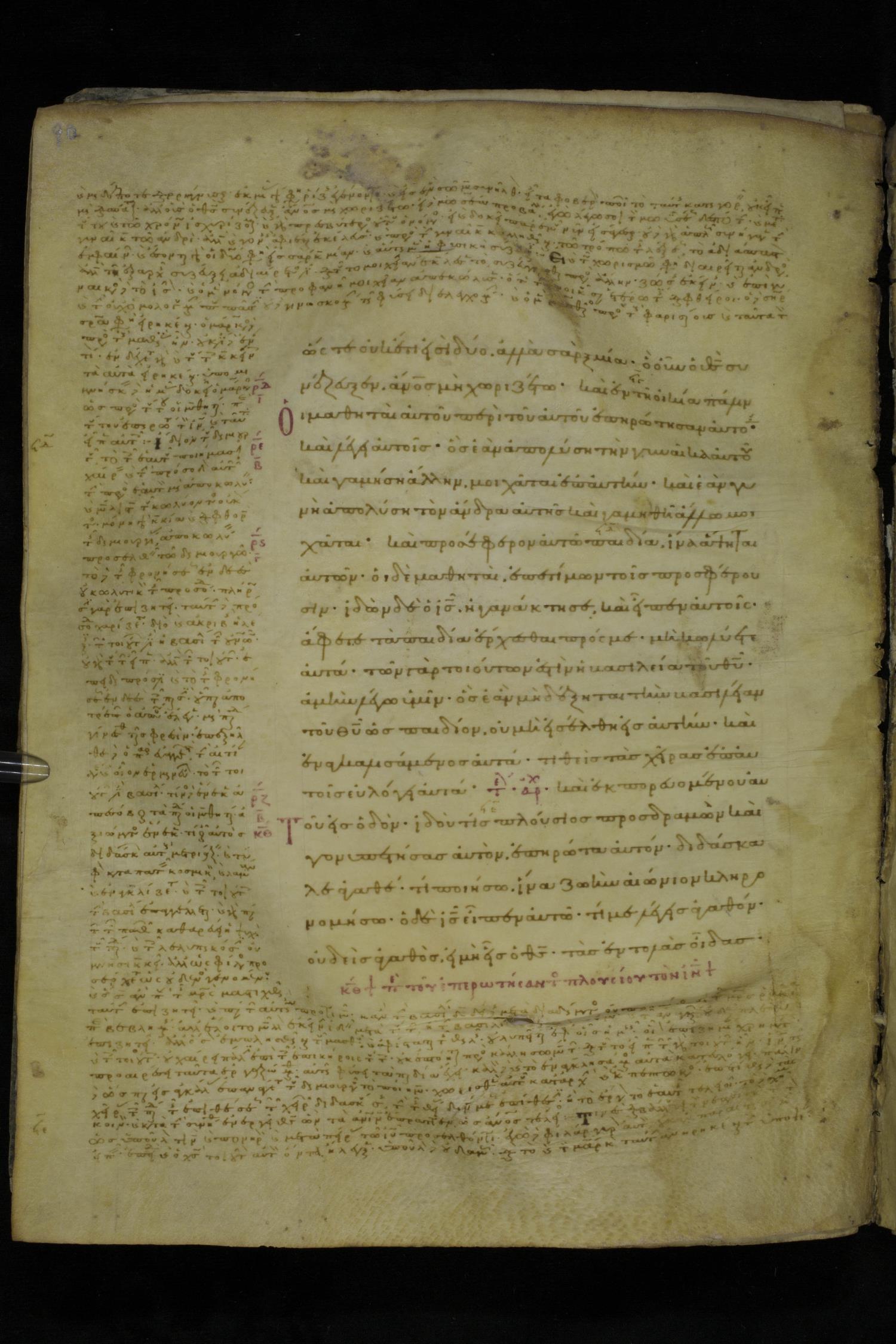 Tenth century minuscule of the Gospels with commentary on parchment; 153 leaves, 1 column, 20 lines per page. Images were taken at the National Library of Greece in Athens.